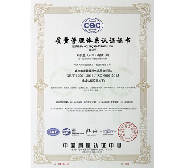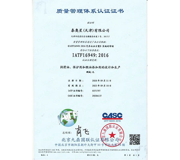 泰奧星(天津)有限公司的IATF16949:2016認證證書