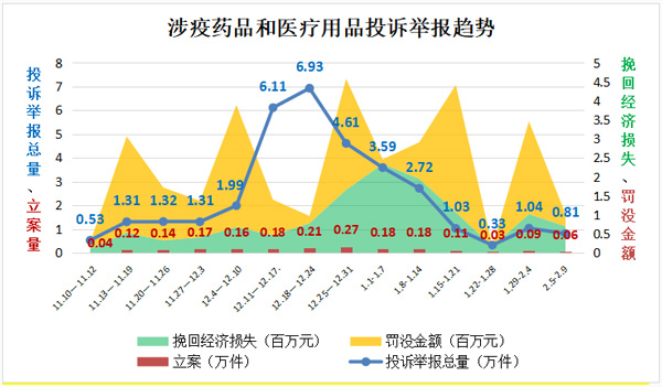 “二十條”和“新十條”出臺(tái)后,疫情防疫重心從防控感染轉(zhuǎn)到醫(yī)療救治,涉疫藥品和醫(yī)療用品需求激增、供應(yīng)不暢,價(jià)格異常波動(dòng)、產(chǎn)品質(zhì)量問題頻現(xiàn),相關(guān)投訴舉報(bào)咨詢量一度呈井噴式增長(zhǎng)。2022年11月10日至2022年底,全國(guó)12315平臺(tái)接收相關(guān)投訴舉報(bào)24.11萬(wàn)件,同比增長(zhǎng)3.88倍,環(huán)比增長(zhǎng)2.95倍,最高峰值達(dá)到19.5倍。其中,投訴14.18萬(wàn)件,舉報(bào)9.93萬(wàn)件,挽回經(jīng)濟(jì)損失498.17萬(wàn)元。