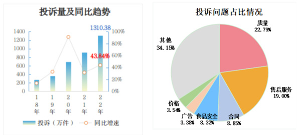 2022年,全國(guó)市場(chǎng)監(jiān)管部門受理消費(fèi)者投訴1310.38萬(wàn)件,同比增長(zhǎng)43.84%,增速較2021年有所放大。從投訴問題看,質(zhì)量298.70萬(wàn)件、售后服務(wù)248.96萬(wàn)件、合同115.91萬(wàn)件、食品安全109.06萬(wàn)件,合計(jì)占投訴的58.96%。其中,售后服務(wù)問題增長(zhǎng)最快,群眾反映最強(qiáng)烈,同比增長(zhǎng)57.67%。