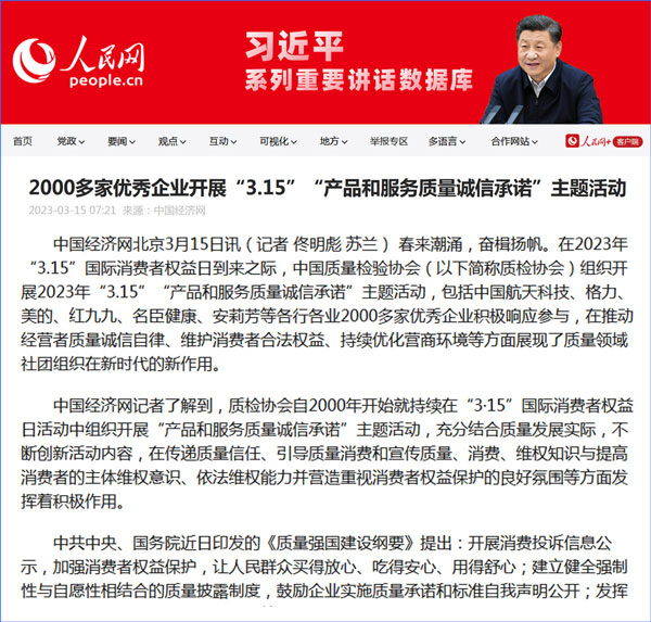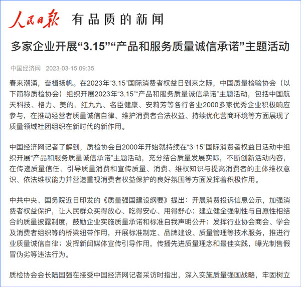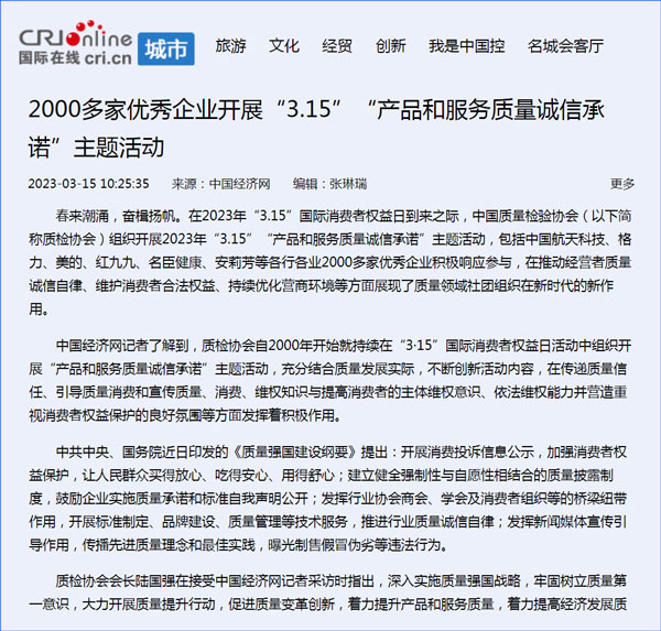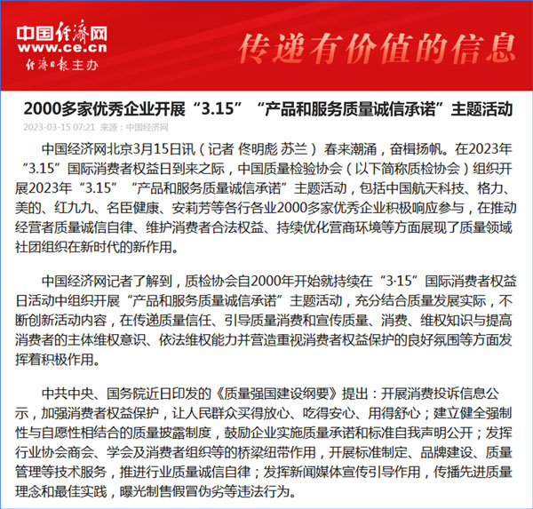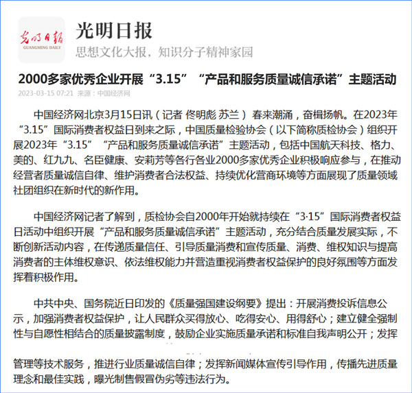 中國質(zhì)量報(bào):凝心聚力譜寫引導(dǎo)質(zhì)量消費(fèi)新篇章——中國質(zhì)檢協(xié)會(huì)組織兩千多家企業(yè)開展“產(chǎn)品和服務(wù)質(zhì)量誠信承諾”主題活動(dòng)
