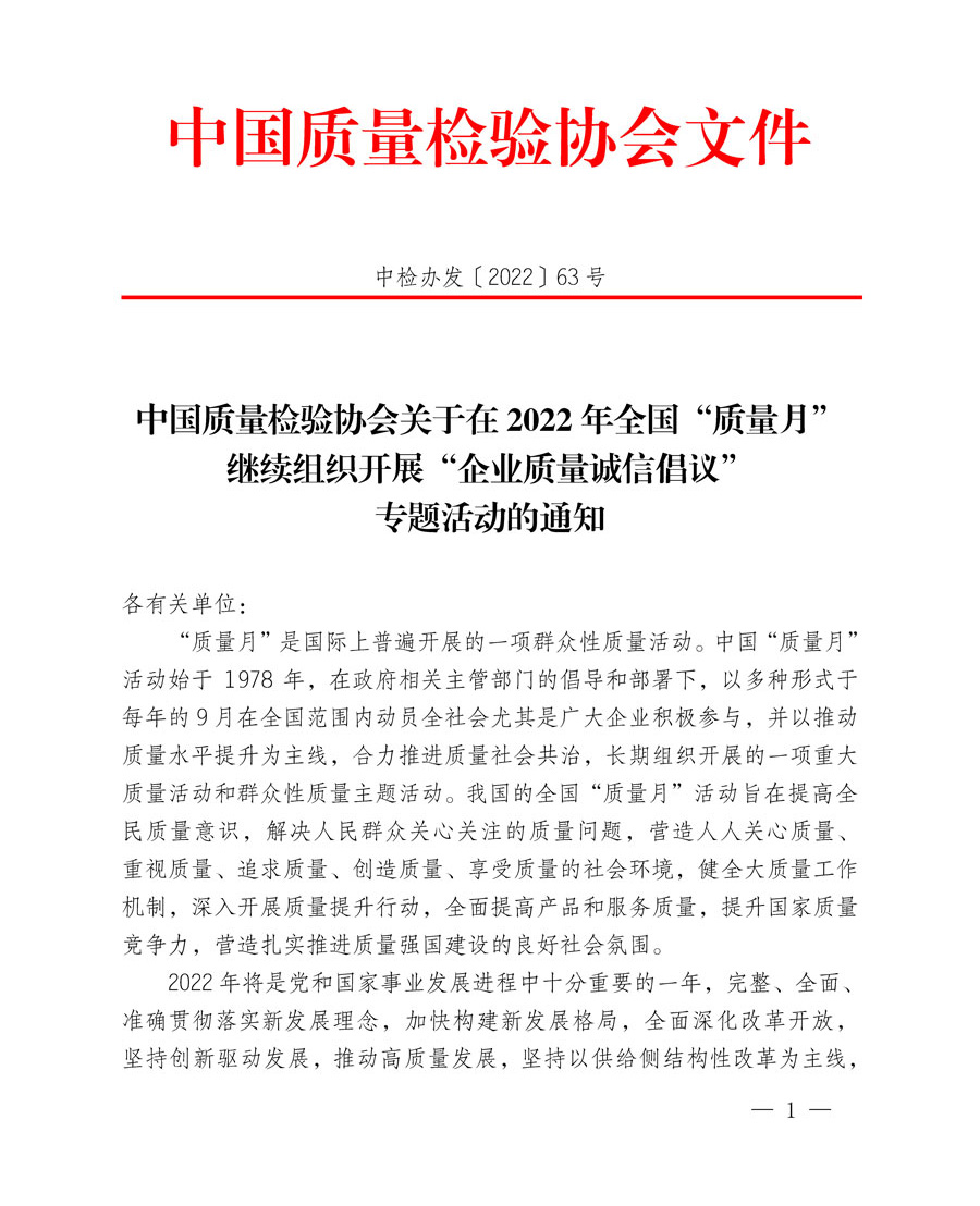 中國質(zhì)量檢驗協(xié)會作為我國質(zhì)量檢驗行業(yè)組織和質(zhì)量專業(yè)社團機構(gòu),積極響應(yīng)2022年全國“質(zhì)量月”活動部署,充分發(fā)揮推動全社會質(zhì)量共治的橋梁紐帶作用,謹(jǐn)此組織各行各業(yè)在質(zhì)量發(fā)展、質(zhì)量提升、質(zhì)量變革、質(zhì)量創(chuàng)新、質(zhì)量誠信等方面具有良好示范作用的2000家優(yōu)秀企業(yè)共同發(fā)出《2022年全國“質(zhì)量月”企業(yè)質(zhì)量誠信倡議書》,全面樹立質(zhì)量標(biāo)桿,動員廣大企業(yè)開展群眾性質(zhì)量活動,大力弘揚社會主義核心價值觀,推動形成崇尚誠信、踐行誠信的良好風(fēng)尚,營造質(zhì)量誠信社會氛圍,在全社會掀起建設(shè)質(zhì)量強國的熱潮。