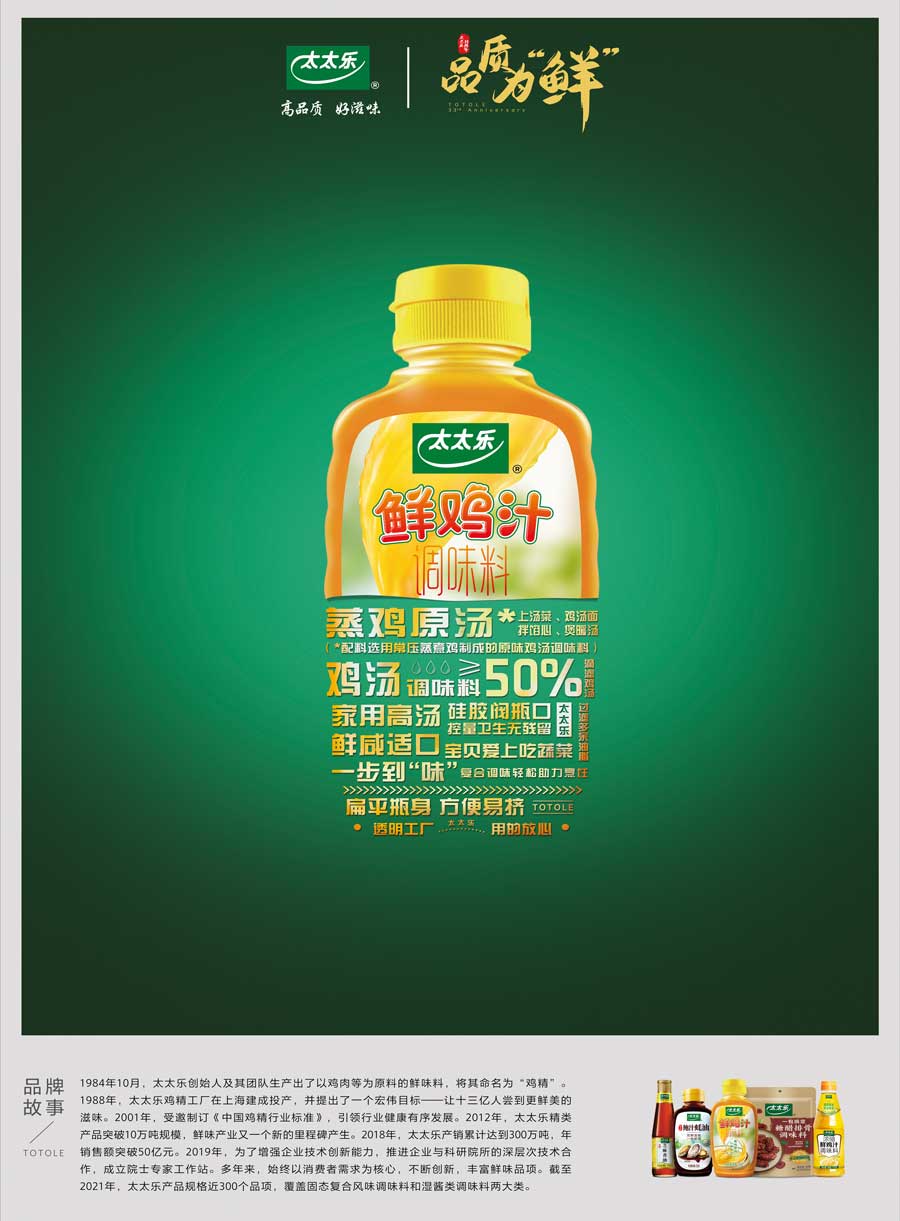 主要產(chǎn)品:三鮮雞精、鮮雞汁、太太樂原味鮮醬油系列、湯之鮮系列、菜譜式調(diào)料系列、蠔油系列、天天旺等