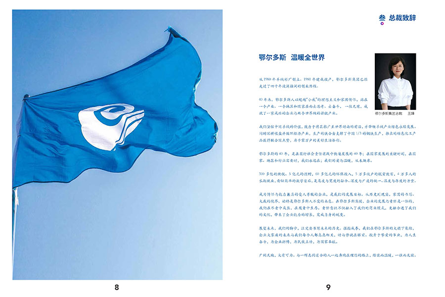 鄂爾多斯集團(tuán)擁有成員企業(yè)100 多家,員工4 萬余人,羊絨產(chǎn)業(yè)和循環(huán)經(jīng)濟(jì)產(chǎn)業(yè)兩大產(chǎn)業(yè)板塊,以及1436、ERDOS、鄂爾多斯1980、BLUE ERDOS、erdos KIDS 5 個(gè)知名服裝品牌組成的品牌家族。站在新的發(fā)展起點(diǎn)上,鄂爾多斯集團(tuán)將繼續(xù)以“立民族志氣,創(chuàng)世界名牌”為使命,遵循“科技綠色、循環(huán)發(fā)展”的經(jīng)營(yíng)主線,繼續(xù)發(fā)揚(yáng)奮發(fā)有為、事在人為的創(chuàng)業(yè)精神,以更加雄厚的經(jīng)濟(jì)實(shí)力,更加堅(jiān)定的發(fā)展步伐、更加高遠(yuǎn)的戰(zhàn)略構(gòu)想,建設(shè)具有國(guó)際競(jìng)爭(zhēng)力的幸福企業(yè),實(shí)現(xiàn)“溫暖全世界”的宏偉目標(biāo)。
