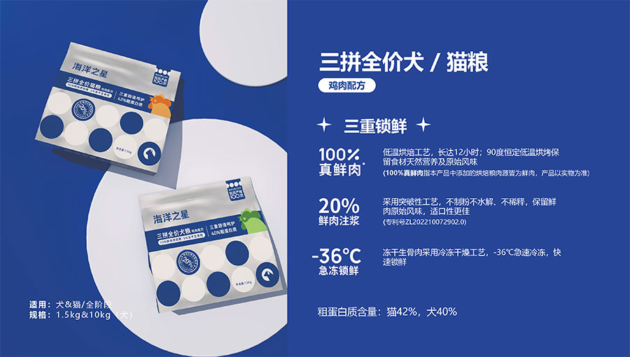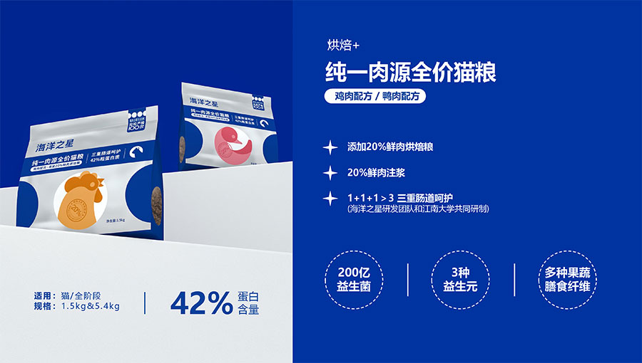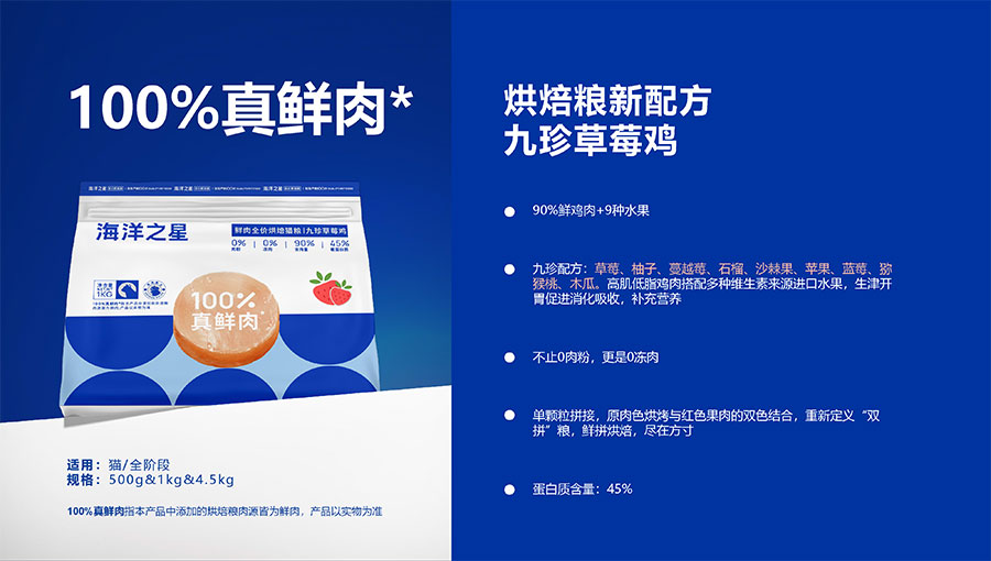 隨著營(yíng)養(yǎng)消費(fèi)逐步升級(jí),海洋之星品牌產(chǎn)品線延展至多肉源、多品類,并正式布局烘焙糧市場(chǎng),以“100%真鮮肉*”重新定義高端烘焙糧品類,為寵主和愛寵提供高品質(zhì)的寵物主糧產(chǎn)品。