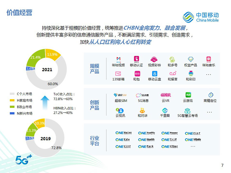 2022年,中國移動全年營運收入達到人民幣9,373億元,同比增長10.5%,其中通信服務(wù)收入達到人民幣8,121億元,同比增長8.1%。CHBN客戶規(guī)模、收入規(guī)模全面增長,HBN收入占通信服務(wù)收入比達到39.8%,同比提升4.1個百分點。得益于5G應(yīng)用、移動云、數(shù)字內(nèi)容、智慧家庭等業(yè)務(wù)的快速拓展,數(shù)字化轉(zhuǎn)型收入達到人民幣2,076億元,同比增長30.3%。整體來看,公司著力打造的數(shù)字化轉(zhuǎn)型收入增長“第二曲線”卓有成效,收入結(jié)構(gòu)更加均衡穩(wěn)健,可持續(xù)增長動能不斷增強,抗風(fēng)險能力顯著提升。