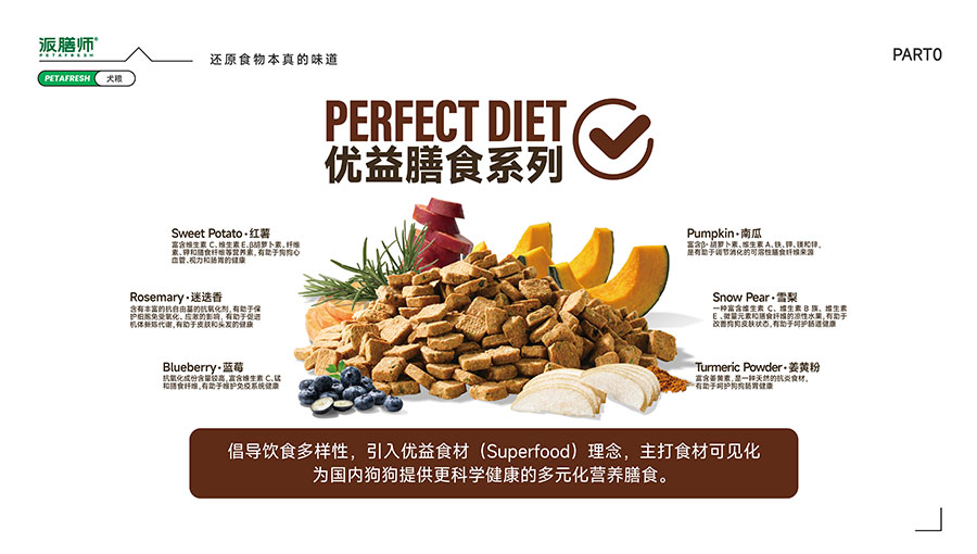 目前派膳師已擁有鮮食、零食、主糧等產(chǎn)品線,主打中高端主糧品類。全新(Perfect Diet)優(yōu)益膳食犬糧系列,倡導(dǎo)飲食多樣性,引入優(yōu)益食材(Superfood)理念,主打食材可見化,為國內(nèi)狗狗提供更科學(xué)健康的多元化營養(yǎng)膳食。