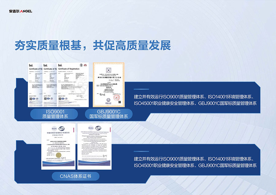 安吉爾擁有三大生產(chǎn)基地,其中安吉爾環(huán)境科技智慧園占地超60萬平方米,可實現(xiàn)年產(chǎn)1000萬臺(套)的凈飲水產(chǎn)品規(guī)模。安吉爾擁有完整的生產(chǎn)管理體系,已獲中國CQC、美國UL、美國NSF、加拿大CSA、法國BV、英國ITS、瑞士SGS和德國TüV全球八項權威機構認證。