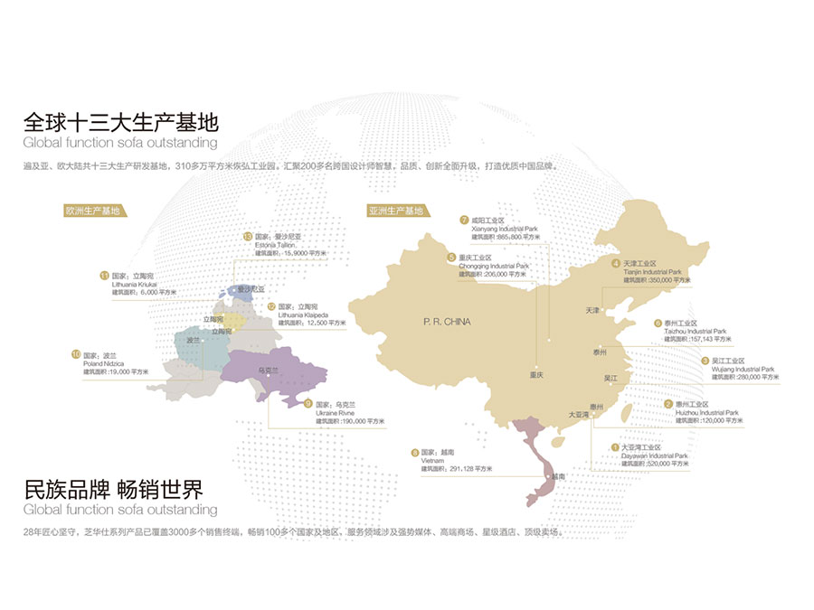 在全球設(shè)有多家子公司、分公司及關(guān)聯(lián)公司,運營網(wǎng)絡(luò)橫跨亞、美、歐、澳四大洲,擁有超過8000個銷售終端,產(chǎn)品暢銷中國、美國、英國、加拿大等100多個國家及地區(qū),旗下“CHEERS”、“芝華仕”和“頭等艙”品牌專賣店超過8000家,形成了體系完備的全球跨國發(fā)展大格局,已成為集研發(fā)、制造、銷售和服務(wù)于一體的國際化智能家居企業(yè)。