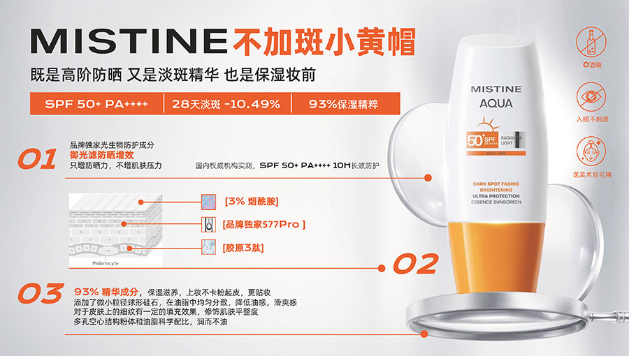MISTINE蜜絲婷堅持圍繞對“光”的研究,在光與防曬護膚、光與色彩妝容的產(chǎn)品應用層面,研究光、理解光、樂享光,持續(xù)不斷地提供產(chǎn)品解決方案,滿足消費者對防曬美白、潮流妝容、護膚健康的需求。