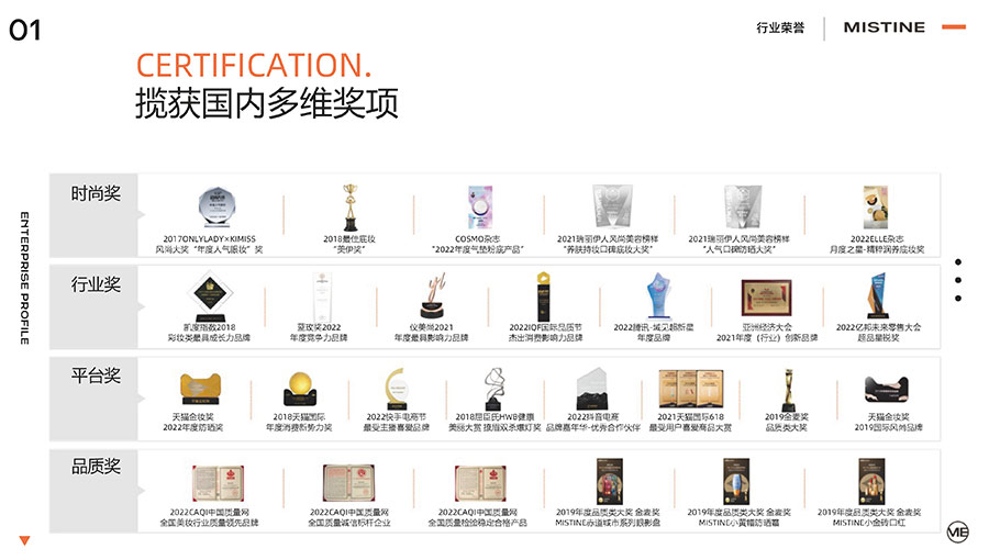37年來,MISTINE蜜絲婷步履不停,堅持從消費者出發(fā),以優(yōu)質(zhì)專研產(chǎn)品、適時而動的渠道策略和持續(xù)發(fā)力的品牌塑造,贏得眾多消費者的喜愛和行業(yè)內(nèi)外的贊許。迄今,MISTINE蜜絲婷已連續(xù)七年攬獲“泰國選擇”大獎,同時先后榮獲中國化妝品大會藍玫獎「年度競爭力品牌」、IQF國際品質(zhì)節(jié)暨消費領導力峰會「杰出消費影響力品牌」、CAQI中國質(zhì)量網(wǎng)「全國美妝行業(yè)質(zhì)量領先品牌」、天貓金妝獎超級單品「年度防曬獎」、凱度消費者指數(shù)「極具成長力品牌」等榮譽。