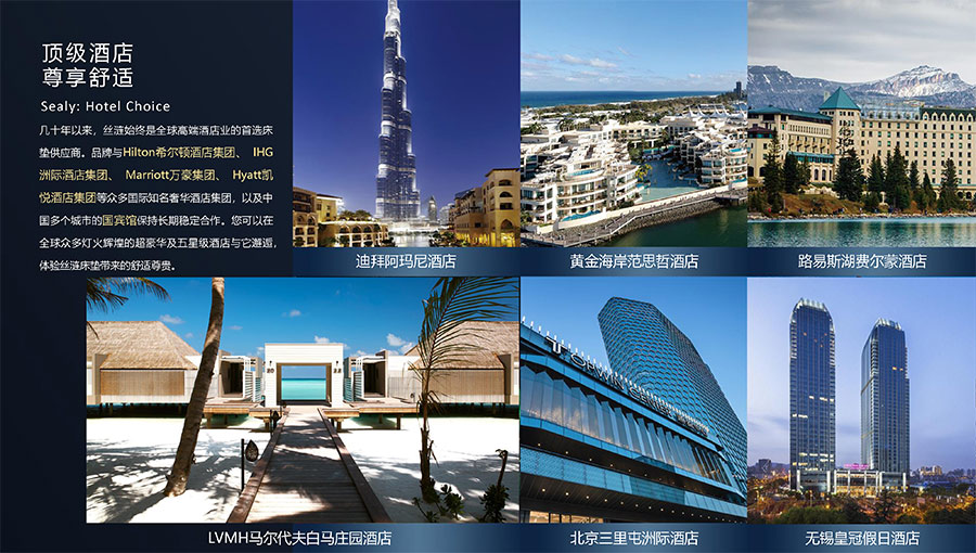 幾十年以來,絲漣始終是全球高端酒店業(yè)的首選床墊供應(yīng)商。品牌與Hilton希爾頓酒店集團、IHG洲際酒店集團、Marriott萬豪集團、Hyatt凱悅酒店集團等眾多國際知名奢華酒店集團,以及中國多個城市的國賓館保持長期穩(wěn)定合作。您可以在全球眾多燈火輝煌的超豪華及五星級酒店與它邂逅,體驗絲漣床墊帶來的舒適尊貴。