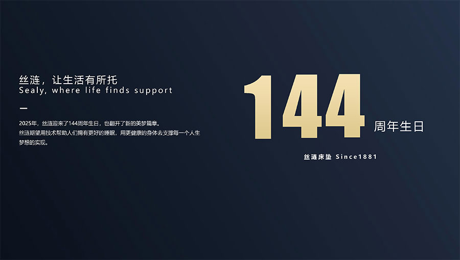 絲漣SEALY1881年誕生于美國,自1885年第一張絲漣床墊問世伊始,便憑借其卓越性能與舒適安睡體驗聲名大噪。1950年,絲漣開創(chuàng)床墊與醫(yī)學(xué)權(quán)威共研的先河,絲漣美姿以科學(xué)的脊柱支撐理念徹底重塑了床墊行業(yè)。75年來,持續(xù)的技術(shù)升級和創(chuàng)新使得美姿彈簧不斷進化,只為打造更加舒適健康的睡眠體驗。