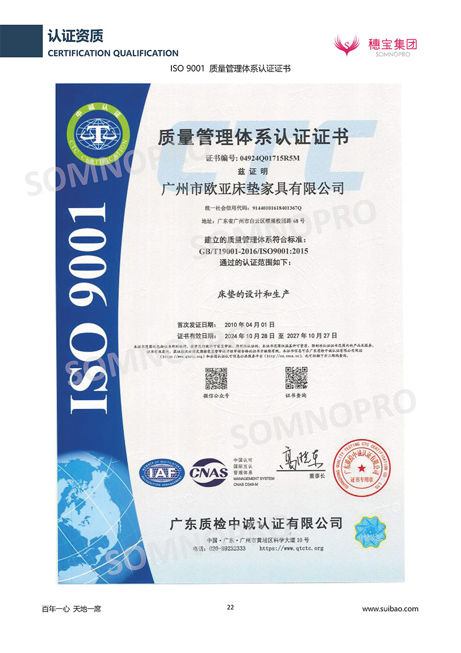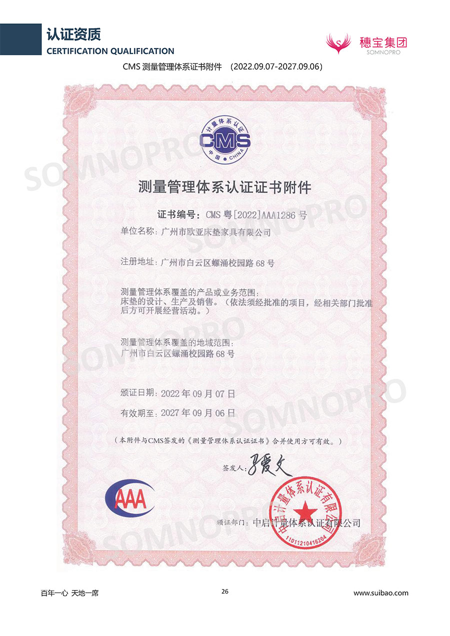 本著高品質(zhì)、高效率、重管理的原則,穗寶已通過ISO9001質(zhì)量管理體系認證證書、ISO14001環(huán)境管理體系認證證書、ISO45001職業(yè)健康安全管理體系認證證書、中國環(huán)境標志產(chǎn)品認證證書、家居綠色環(huán)保領(lǐng)跑品牌、綠色正品家居品牌、企業(yè)標準“綠色領(lǐng)跑者”證書、CMS測量管理體系證書、CMS測量管理體系證書附件、廣東省“守信用重合同”企業(yè)、廣州歐亞-納稅信用A級納稅人(連續(xù)5年:2018-2022)、2024年中國500最具價值品牌,品牌價值高達302.89億元、廣東高價值商標品牌(穗寶)、廣東省重點商標保護名錄納入證明、廣州市勞動關(guān)系和諧企業(yè)AA級。穗寶自創(chuàng)立以來,不斷致力于新產(chǎn)品的設(shè)計與研發(fā),多次在國內(nèi)家具展會屢獲獎項,產(chǎn)品暢銷國內(nèi)外,深受客戶一致好評。