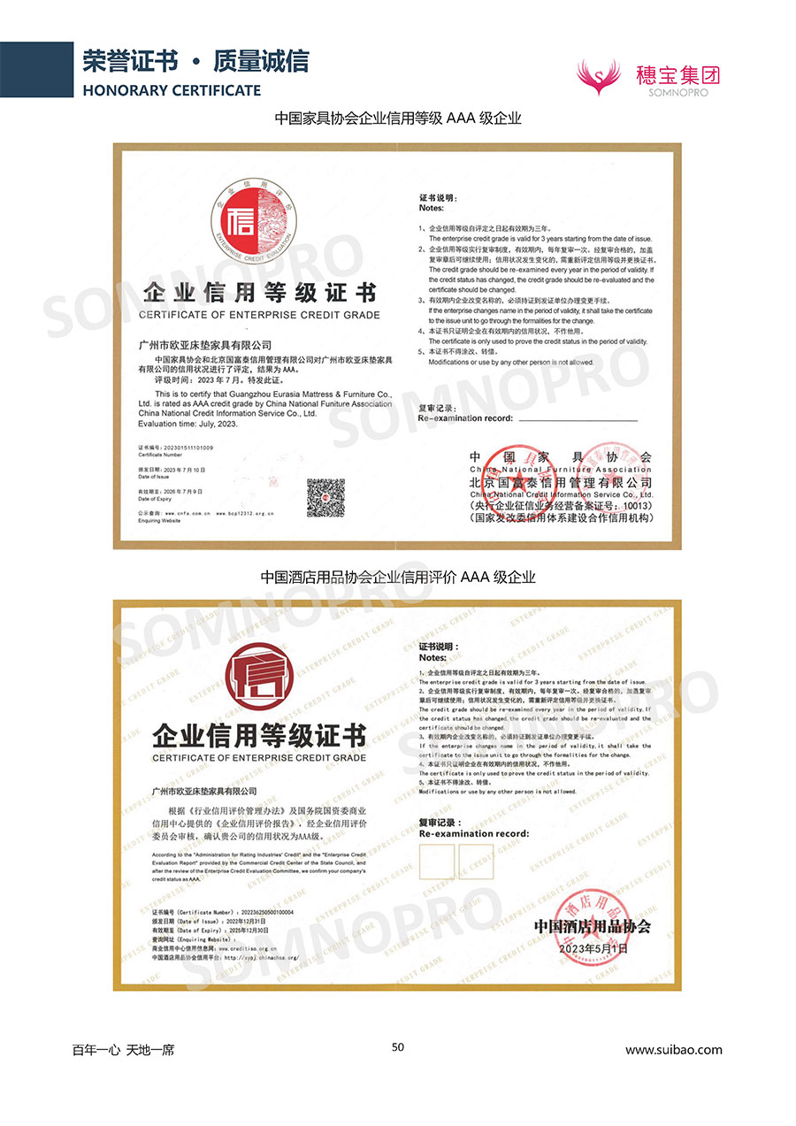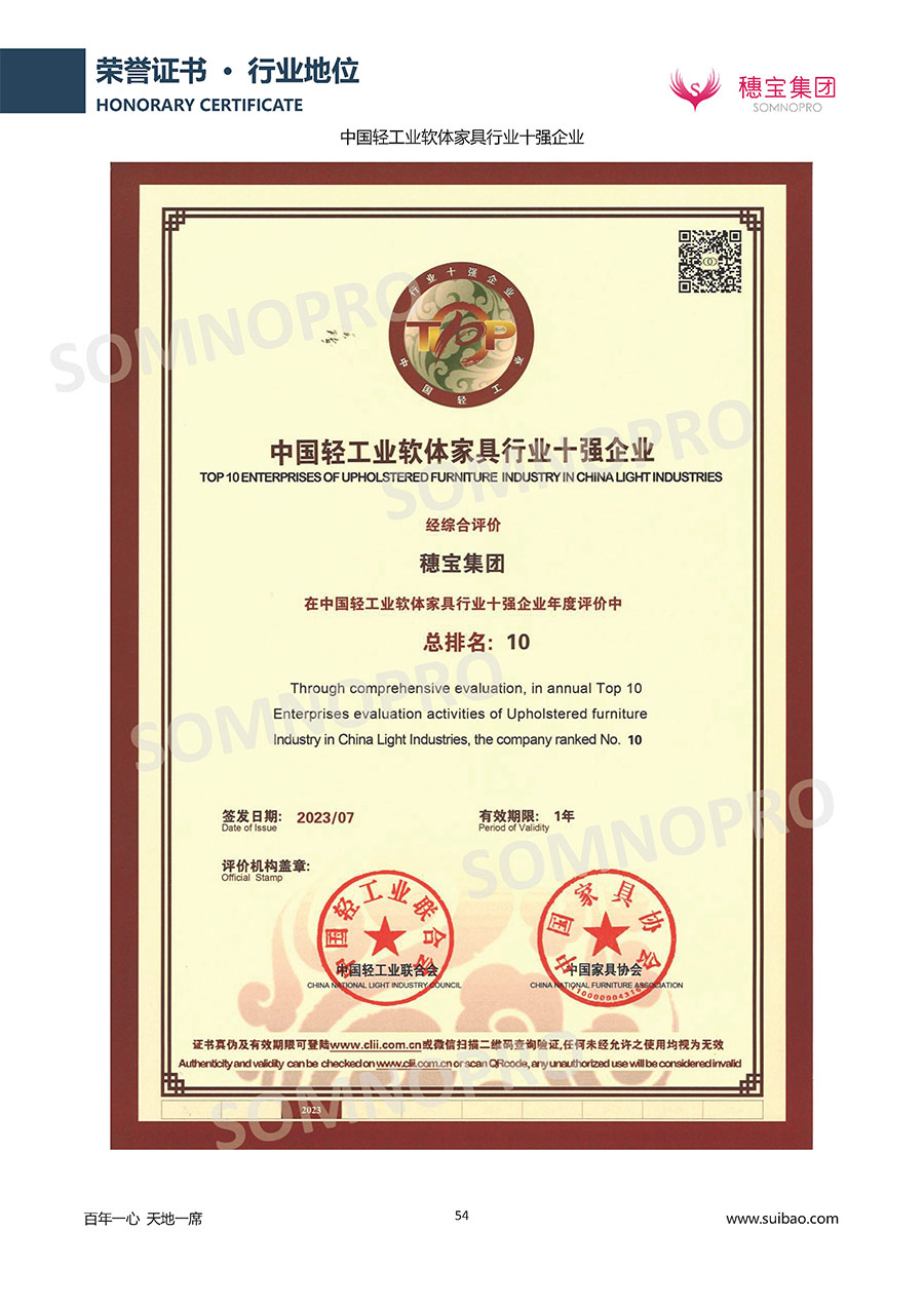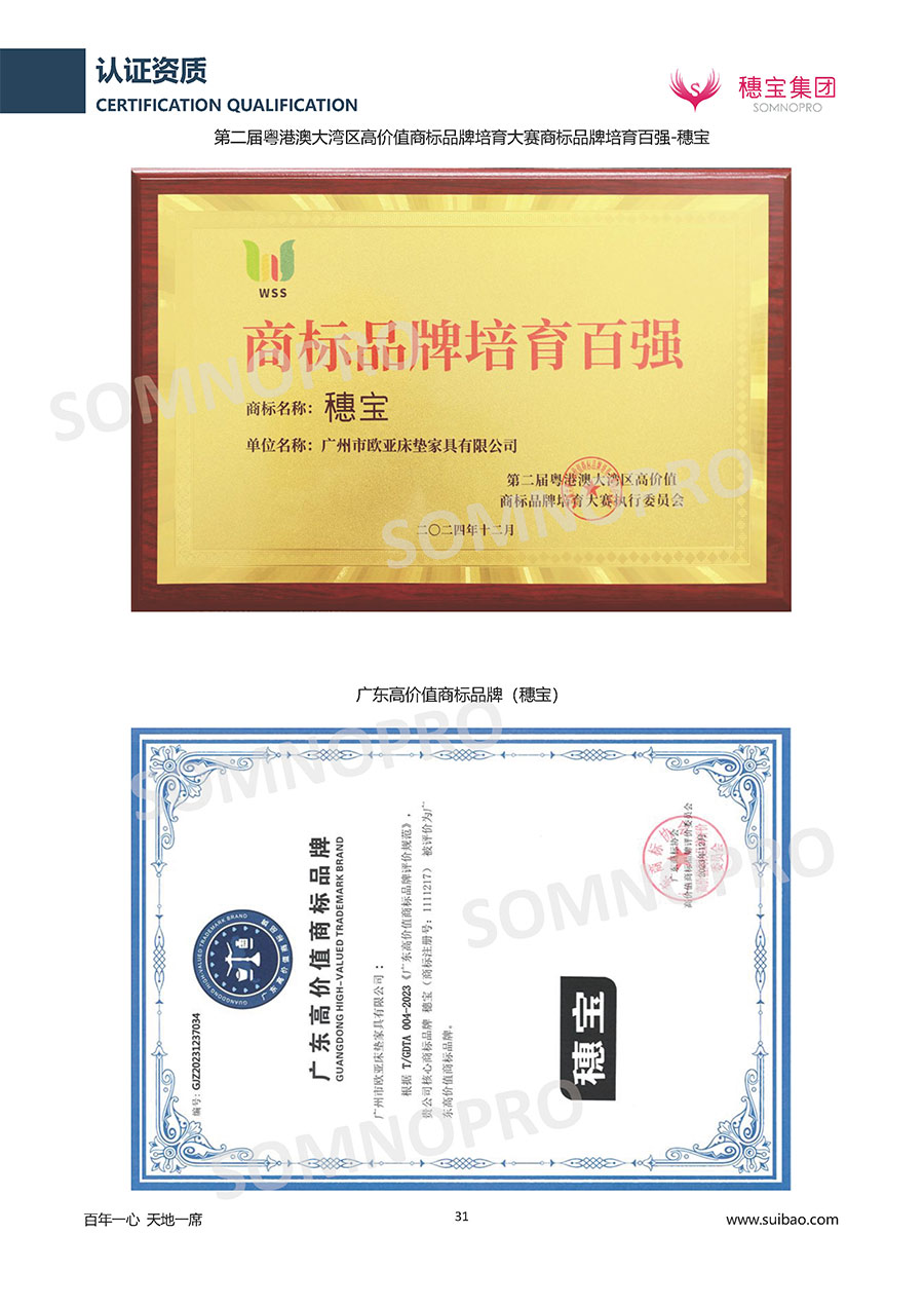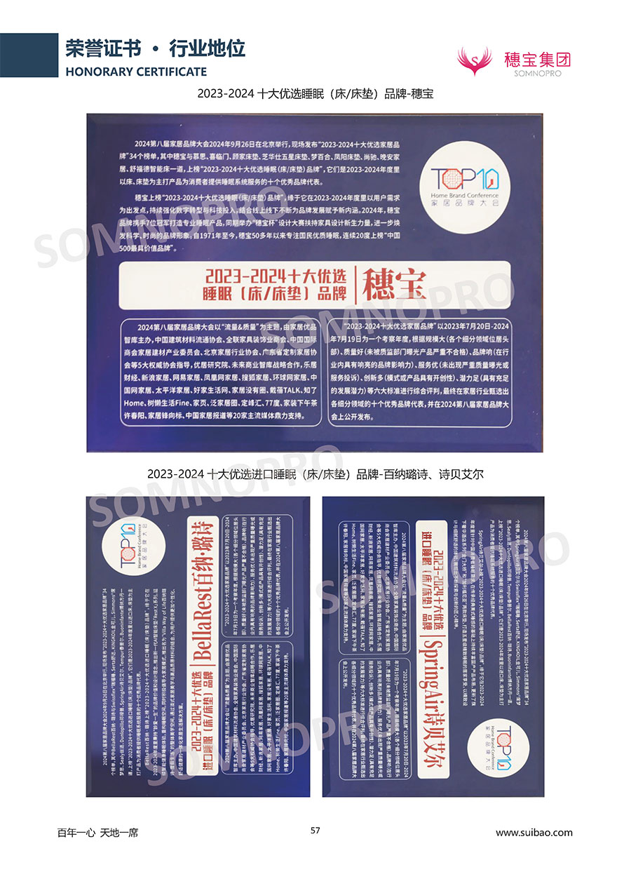 自1971年獨立研發(fā)生產(chǎn)出專屬國人的彈簧床墊,穗寶關(guān)于優(yōu)質(zhì)深度睡眠的研究已有半個世紀的歷史。穗寶一直專注床墊,專注中國消費者的睡眠研究,針對中國人特點進行優(yōu)化創(chuàng)新,不斷提升國人的睡眠體驗,只為成就每個晚上8小時的優(yōu)質(zhì)深度睡眠。憑借不斷革新的研發(fā)科技和深受消費者信賴的產(chǎn)品品質(zhì),穗寶集團旗下品牌和產(chǎn)品屢獲國內(nèi)外大獎,連續(xù)20年榮膺中國500最具價值品牌,品牌價值高達302.89億元。