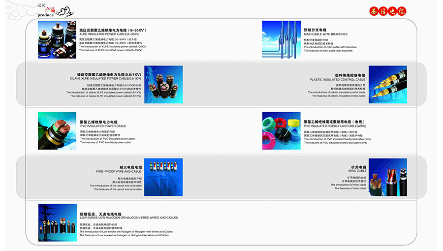 西隆電纜主要產(chǎn)品:高低壓電力電纜(阻燃、耐火、耐寒、耐高溫、低煙無(wú)鹵、低煙低鹵、輻照交聯(lián)、預(yù)分支、電氣化鐵道電纜等)、架空絕緣導(dǎo)線(含耐候架空導(dǎo)線、集束平行導(dǎo)線、ABC架空導(dǎo)線)、架空裸導(dǎo)線(含鋼芯鋁絞線、鋁絞線、鋁合金絞線、鋁包鋼芯鋁絞線等)、電線(民用電線、戶(hù)外耐候線)、控制電纜、橡套電纜、礦用阻燃電纜、硅橡膠電纜、計(jì)算機(jī)電纜、光伏專(zhuān)用電纜、鋁合金電力電纜、氟塑料電纜等。