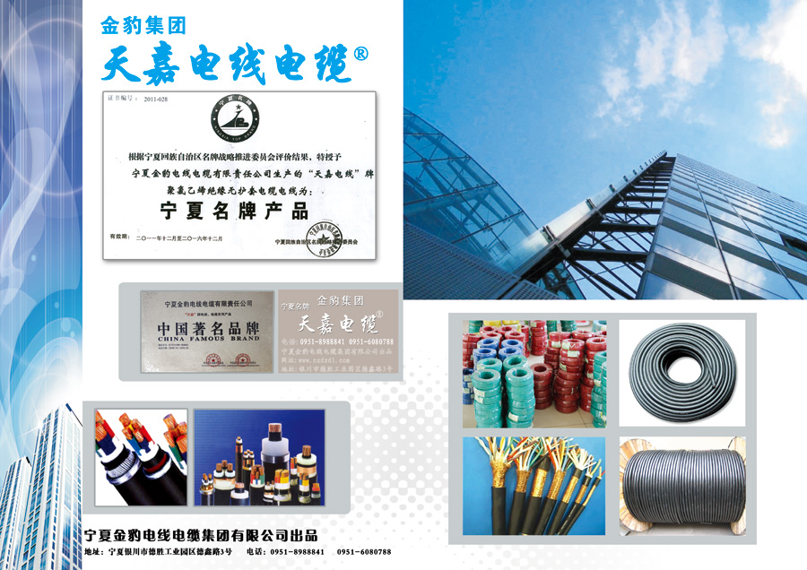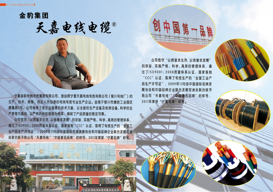 公司信守“以質(zhì)量求生存,以信譽求發(fā)展”的宗旨,實施嚴(yán)格、科學(xué)、高效的管理體系,通過了ISO9001:2008質(zhì)量體系認(rèn)證,國家強制“CCC”認(rèn)證,取得了電纜生產(chǎn)的“全國工業(yè)產(chǎn)品生產(chǎn)許可證”,2009年由中國國際名牌發(fā)展協(xié)會和中國品牌企業(yè)聯(lián)合發(fā)展促進會聯(lián)合授予公司“天嘉電線®”“中國著名品牌”的稱號,2011年榮獲“寧夏名牌”稱號。公司是寧夏質(zhì)量管理協(xié)會副會長單位、銀川市質(zhì)量管理協(xié)會理事單位、賀蘭縣質(zhì)量管理協(xié)會理事單位、中國電器工業(yè)協(xié)會電線電纜分會會員單位。