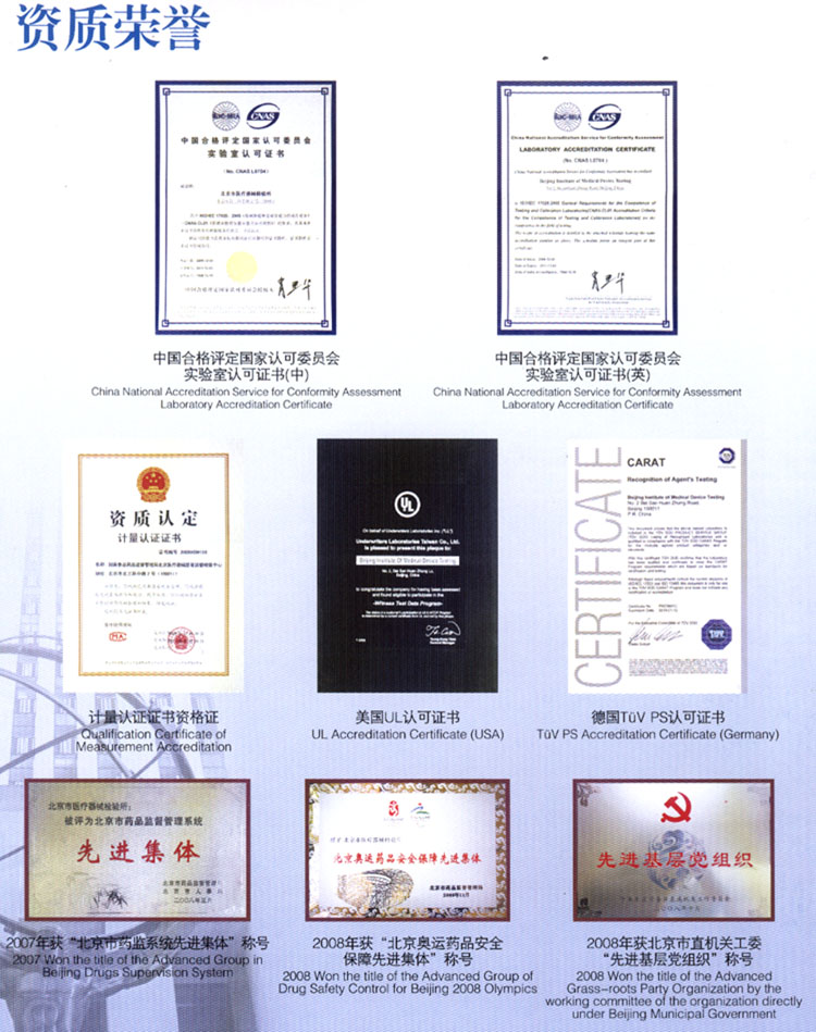 北京市醫(yī)療器械檢驗所(國家食品藥品監(jiān)督管理局北京醫(yī)療器械質(zhì)量監(jiān)督檢驗中心,以下簡稱“北檢所”)是中國合格評定國家認(rèn)可委員會(CNAS)、中國國家認(rèn)證認(rèn)可監(jiān)督管理委員會(CNCA)、國家食品藥品監(jiān)督管理局(SFDA)等部門認(rèn)可授權(quán)的一所綜合性醫(yī)療器械產(chǎn)品檢測機構(gòu)。經(jīng)CNAS授權(quán)的檢驗范圍涵蓋醫(yī)用電子、醫(yī)用射線、核醫(yī)學(xué)、電聲學(xué)、體外診斷系統(tǒng)、一次性醫(yī)療產(chǎn)品、醫(yī)用防護(hù)用品、醫(yī)用橡膠制品、口腔材料、生物安全柜、電磁兼容、生物相容性等專業(yè)領(lǐng)域,檢驗項目涉及472項;經(jīng)SFDA授權(quán)檢測項目達(dá)599項,承擔(dān)著授權(quán)范圍內(nèi)醫(yī)療器械產(chǎn)品監(jiān)督抽驗檢驗、注冊檢驗、認(rèn)證檢驗、進(jìn)出口商品檢驗、科技成果鑒定檢驗以及委托檢驗、仲裁檢驗等檢測任務(wù);2002年,成為中國質(zhì)量認(rèn)證中心(CQC)簽約實驗室,承擔(dān)醫(yī)用X射線診斷設(shè)備、心電圖機、血液透析裝置和橡膠避孕套的強制性產(chǎn)品安全認(rèn)證檢測任務(wù)。此外,該所先后獲得TüV PS、UL等國際權(quán)威認(rèn)證機構(gòu)的認(rèn)可,是目前國內(nèi)開展檢驗業(yè)務(wù)專業(yè)最全面的醫(yī)療器械檢驗機構(gòu)。