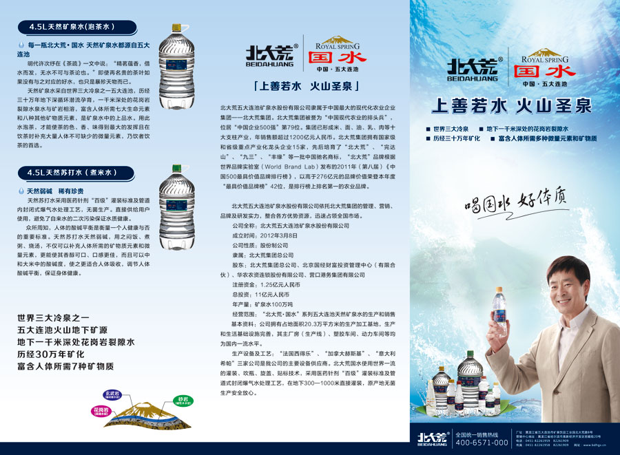北大荒五大連池礦泉水股份有限公司成立于2012年3月8日,隸屬于北大荒集團(tuán)總公司,其股東為:北大荒集團(tuán)總公司、北京國經(jīng)財(cái)富投資管理中心(有限合伙)、華農(nóng)農(nóng)資連鎖股份有限公司、營口港務(wù)集團(tuán)有限公司。其注冊資金1.25億元人民幣,總投資11億元人民幣。北大荒五大連池礦泉水股份有限公司擁有占地面積20.3萬平方米的生產(chǎn)加工基地,生產(chǎn)和生活基礎(chǔ)設(shè)施完善,由主廠房(生產(chǎn)線)、塑膠車間、動力車間、辦公樓、食堂宿舍及相關(guān)附屬設(shè)施組成。其經(jīng)營范圍為“北大荒•國水”系列五大連池天然礦泉水的生產(chǎn)和銷售,礦泉水年產(chǎn)量100萬噸。