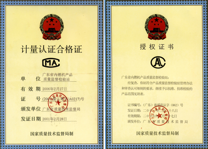 廣東省內(nèi)燃機產(chǎn)品質(zhì)量監(jiān)督檢驗站是1987年根據(jù)廣東省標(biāo)準(zhǔn)計量管理局(現(xiàn)省質(zhì)量技術(shù)監(jiān)督局)和廣東省機械工業(yè)廳(現(xiàn)廣東省機械工業(yè)集團公司)聯(lián)合發(fā)(1987)376號文批準(zhǔn)籌建的。1989年經(jīng)審查認(rèn)證,獲得了省科委頒發(fā)的“科技成果檢測檢定資格證書”。1990年6月首次通過了廣東省質(zhì)量技術(shù)監(jiān)督局和廣東省機械工業(yè)廳組織的計量認(rèn)證和審查認(rèn)可,獲得了省質(zhì)量技術(shù)監(jiān)督頒發(fā)的“計量認(rèn)證合格證”、“計量認(rèn)證合格證單位”等證書。1995年和2000年通過了省質(zhì)量技術(shù)監(jiān)督的審查認(rèn)可復(fù)查,并獲得“計量認(rèn)證資格證”和依法授權(quán)的產(chǎn)品質(zhì)量監(jiān)督檢驗證書。
