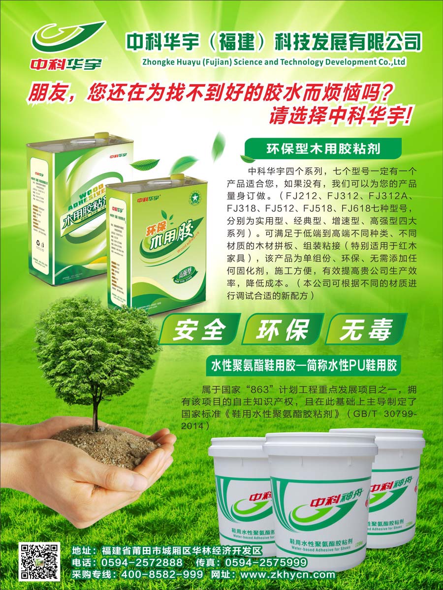 主要產品:中科華宇牌、中科神舟牌鞋用水性聚氨酯膠粘劑、環(huán)保型木用膠粘劑、晶瓷王、無苯無醛萬能膠等膠粘劑產品