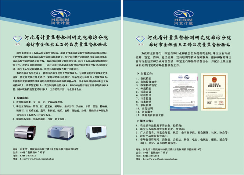 廊坊市金銀寶玉石飾品質(zhì)量監(jiān)督檢驗(yàn)站隸屬于河北省計(jì)量監(jiān)督檢測研究院廊坊分院,于1998年6月經(jīng)河北省市場監(jiān)督管理局批準(zhǔn)建立,經(jīng)中國合格評(píng)定國家認(rèn)可委員會(huì)和河北省市場監(jiān)督管理局認(rèn)證和授權(quán),我站可面向社會(huì)開展貴金屬、珠寶玉石飾品檢驗(yàn)檢測鑒定等工作,我站為廊坊地區(qū)唯一一家合法并經(jīng)河北省市場監(jiān)督管理局批準(zhǔn)并授權(quán)建立的貴金屬、珠寶玉石鑒定檢驗(yàn)機(jī)構(gòu),所出具的檢驗(yàn)報(bào)告具有法律效力。