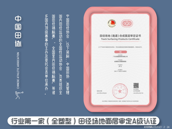3月1日,中國田徑協(xié)會(CHINESE ATHLETIC ASSOCIATION,縮稱CAA)更新了“2020年-2023年經(jīng)中國田徑協(xié)會驗收合格的面層名錄”。憑借優(yōu)異的產(chǎn)品性能、踏實可靠的品牌公信力和雄厚的技術(shù)實力,廣州杰銳體育設(shè)施有限公司多項產(chǎn)品獲證。