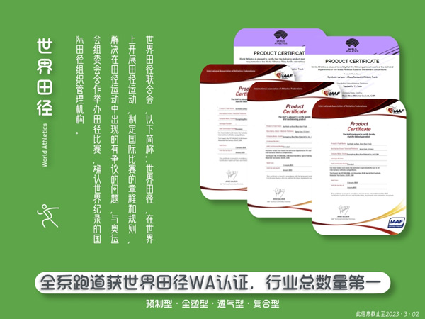 榮獲WA認證的運動地材產(chǎn)品,意味著國際田聯(lián)的背書和肯定,在品質(zhì)、使用體驗、安全性等諸多方面達到國際專業(yè)競賽要求。