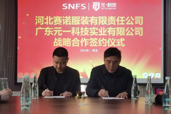 2023年2月27日,河北賽諾服裝有限責(zé)任公司同廣東元一科技實(shí)業(yè)有限公司在石家莊品匯大廈簽署了戰(zhàn)略合作協(xié)議,河北賽諾將引進(jìn)十臺(tái)價(jià)值數(shù)百萬元的自動(dòng)鋪布和自動(dòng)裁床設(shè)備,旨在通過加強(qiáng)雙方在科技方面的協(xié)作進(jìn)一步深化戰(zhàn)略伙伴關(guān)系,推動(dòng)雙方在數(shù)字化、自動(dòng)化、智能化等方面的深度合作和公司的長遠(yuǎn)發(fā)展。