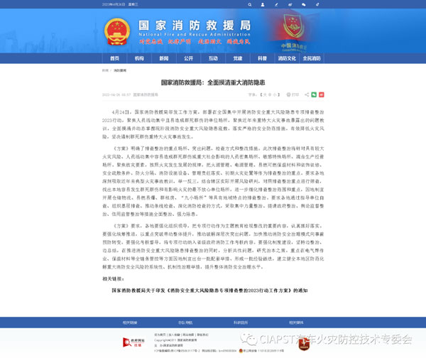 4月24日,國家消防救援局印發(fā)工作方案,部署在全國集中開展消防安全重大風險隱患專項排查整治2023行動,聚焦人員活動集中且易造成群死群傷的單位場所,聚焦近年來重特大火災事故暴露出的問題教訓,全面摸清并動態(tài)掌握現(xiàn)階段消防安全重大風險隱患底數(shù),落實嚴格的安全防范措施,有效降低火災風險,堅決遏制群死群傷重特大火災事故發(fā)生。