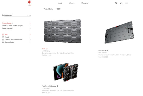 近日,2023年德國(guó)紅點(diǎn)設(shè)計(jì)大獎(jiǎng)名單公布。聯(lián)建光電VAIII系列微間距顯示屏、Pilot Pro系列租賃顯示屏、BIM Plus-X系列室內(nèi)商業(yè)顯示屏三款產(chǎn)品同時(shí)斬獲素有設(shè)計(jì)界“奧斯卡”之稱的紅點(diǎn)設(shè)計(jì)獎(jiǎng),這三款產(chǎn)品凝聚著全球前沿技術(shù)和創(chuàng)新設(shè)計(jì),實(shí)至名歸。據(jù)統(tǒng)計(jì),聯(lián)建光電是2023紅點(diǎn)獎(jiǎng)中獲獎(jiǎng)最多的LED顯示品牌。