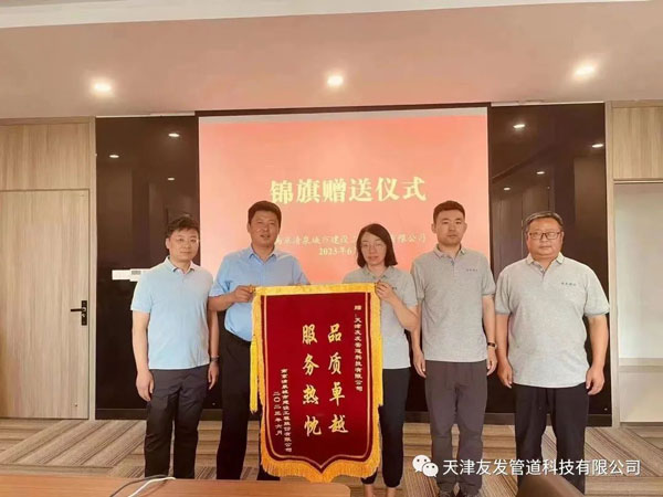 2023年6月,南京清泉城市建設(shè)工程股份有限公司送予天津友發(fā)管道科技有限公司“品質(zhì)卓越 服務(wù)熱忱”的錦旗,對我公司產(chǎn)品質(zhì)量及售后服務(wù)表示認(rèn)可和感謝。