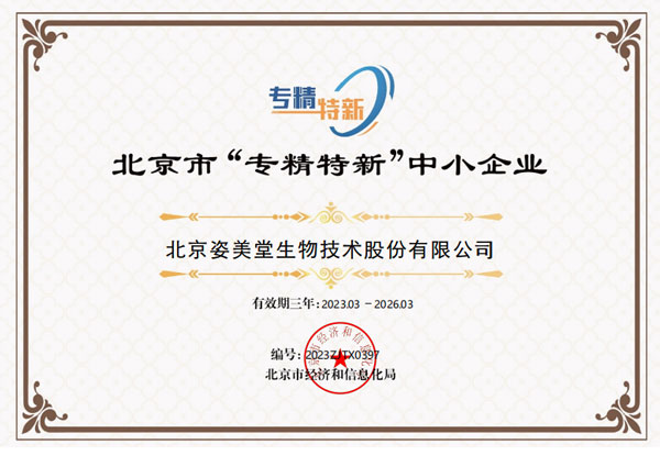 日前,北京市經(jīng)濟(jì)和信息化局正式公布2022年第四季度北京市“專精特新”中小企業(yè)名單,北京姿美堂生物技術(shù)股份有限公司憑借在數(shù)字健康領(lǐng)域的創(chuàng)新技術(shù)實(shí)力和行業(yè)影響力,獲評(píng)認(rèn)定為北京市“專精特新”中小企業(yè),科技創(chuàng)新勢(shì)能持續(xù)釋放。