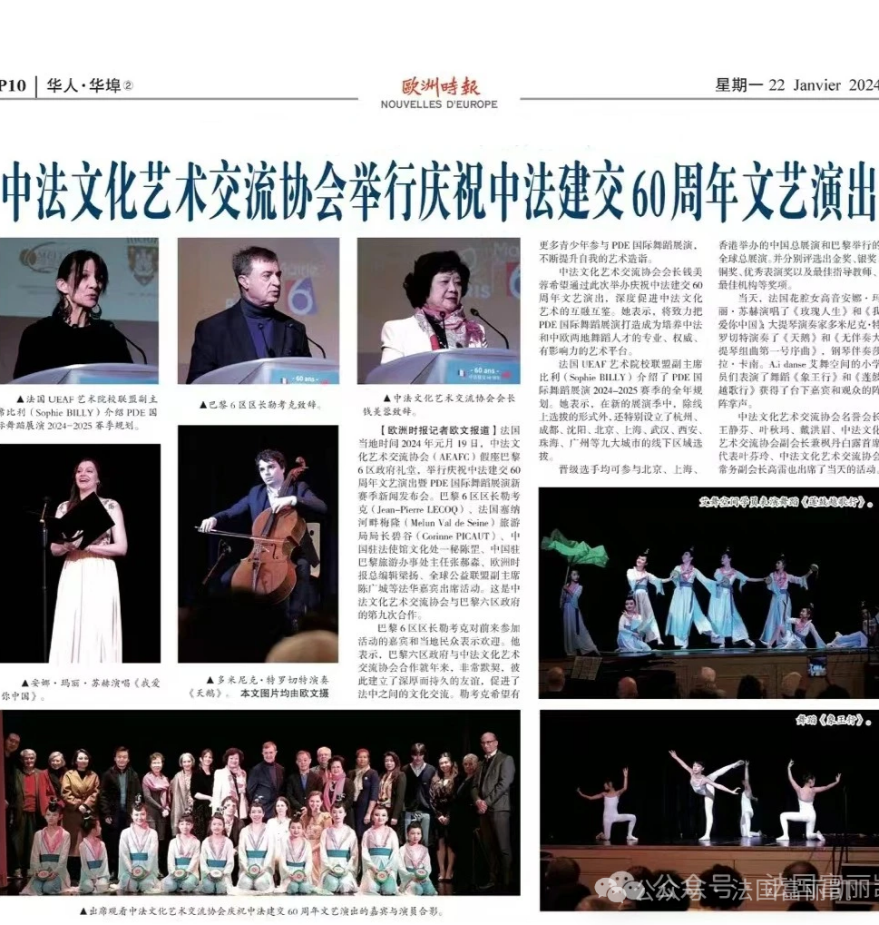1月22日,巴黎當(dāng)?shù)刂形拿襟w《歐洲時報》對中法文化藝術(shù)交流協(xié)會慶祝中法建交60周年活動的報道,刊登了法國富麗凱參加活動的照片。