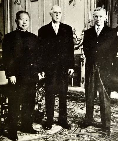左為中國首任駐法大使黃鎮(zhèn),中為時任法國總統(tǒng)戴高樂將軍。