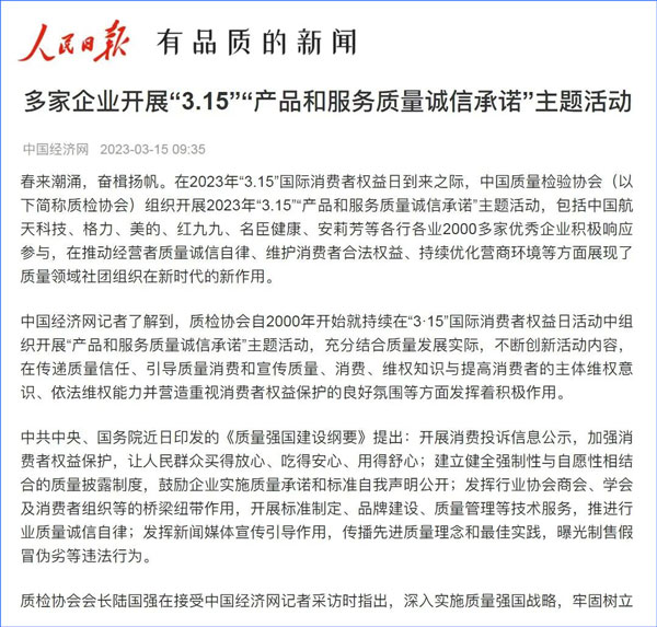 中國(guó)經(jīng)濟(jì)網(wǎng):2000多家優(yōu)秀企業(yè)開(kāi)展“3·15”“產(chǎn)品和服務(wù)質(zhì)量誠(chéng)信承諾”主題活動(dòng)