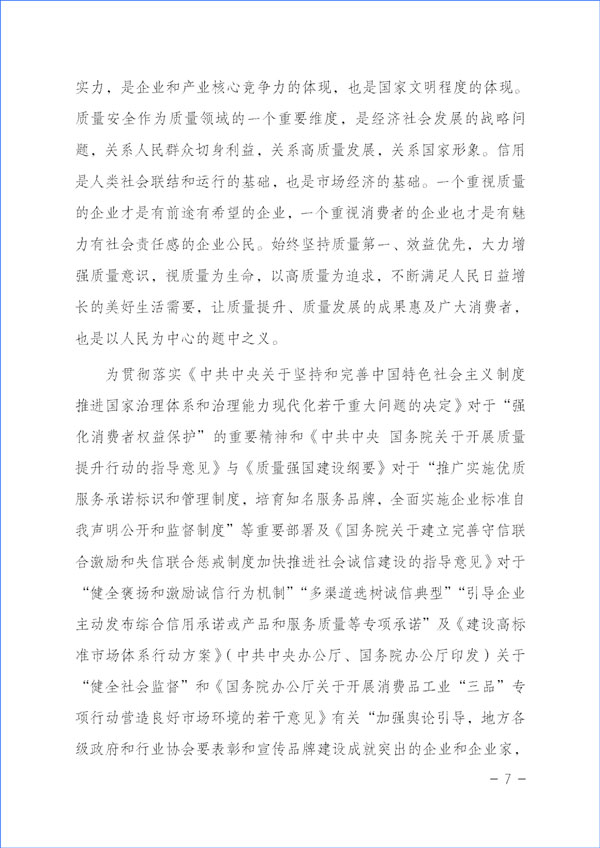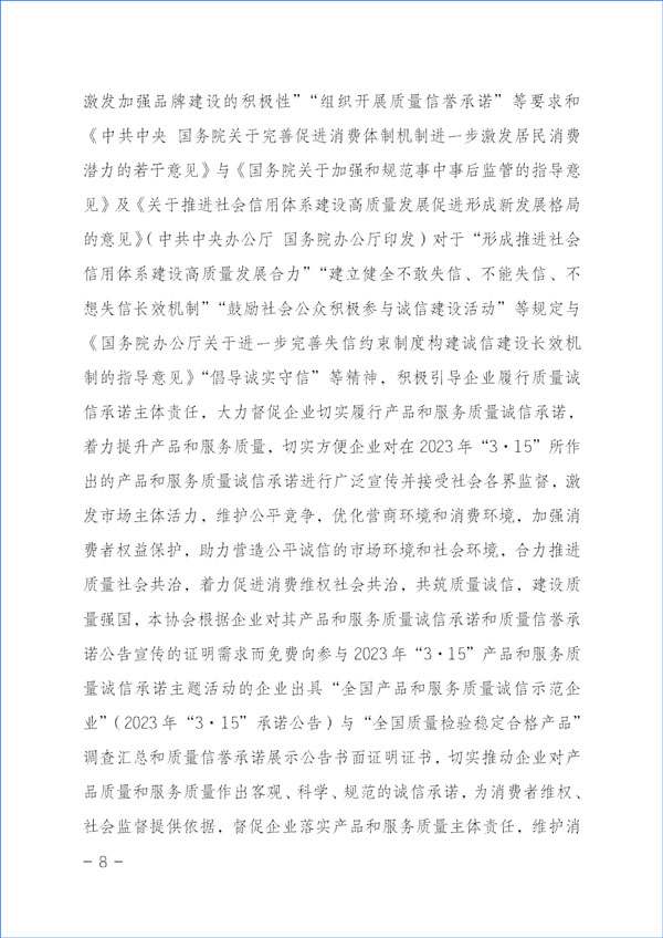 為貫徹落實(shí)《中共中央關(guān)于堅(jiān)持和完善中國(guó)特色社會(huì)主義制度 推進(jìn)國(guó)家治理體系和治理能力現(xiàn)代化若干重大問(wèn)題的決定》對(duì)于“強(qiáng)化消費(fèi)者權(quán)益保護(hù)”的重要精神和《中共中央 國(guó)務(wù)院關(guān)于開(kāi)展質(zhì)量提升行動(dòng)的指導(dǎo)意見(jiàn)》與《質(zhì)量強(qiáng)國(guó)建設(shè)綱要》對(duì)于“推廣實(shí)施優(yōu)質(zhì)服務(wù)承諾標(biāo)識(shí)和管理制度,培育知名服務(wù)品牌,全面實(shí)施企業(yè)標(biāo)準(zhǔn)自我聲明公開(kāi)和監(jiān)督制度”等重要部署及《國(guó)務(wù)院關(guān)于建立完善守信聯(lián)合激勵(lì)和失信聯(lián)合懲戒制度加快推進(jìn)社會(huì)誠(chéng)信建設(shè)的指導(dǎo)意見(jiàn)》對(duì)于“健全褒揚(yáng)和激勵(lì)誠(chéng)信行為機(jī)制”“多渠道選樹(shù)誠(chéng)信典型”“引導(dǎo)企業(yè)主動(dòng)發(fā)布綜合信用承諾或產(chǎn)品和服務(wù)質(zhì)量等專項(xiàng)承諾”及《建設(shè)高標(biāo)準(zhǔn)市場(chǎng)體系行動(dòng)方案》(中共中央辦公廳、國(guó)務(wù)院辦公廳印發(fā))關(guān)于“健全社會(huì)監(jiān)督”和《國(guó)務(wù)院辦公廳關(guān)于開(kāi)展消費(fèi)品工業(yè)“三品”專項(xiàng)行動(dòng)營(yíng)造良好市場(chǎng)環(huán)境的若干意見(jiàn)》有關(guān)“加強(qiáng)輿論引導(dǎo),地方各級(jí)政府和行業(yè)協(xié)會(huì)要表彰和宣傳品牌建設(shè)成就突出的企業(yè)和企業(yè)家,激發(fā)加強(qiáng)品牌建設(shè)的積極性”“組織開(kāi)展質(zhì)量信譽(yù)承諾”等要求和《中共中央 國(guó)務(wù)院關(guān)于完善促進(jìn)消費(fèi)體制機(jī)制進(jìn)一步激發(fā)居民消費(fèi)潛力的若干意見(jiàn)》與《國(guó)務(wù)院關(guān)于加強(qiáng)和規(guī)范事中事后監(jiān)管的指導(dǎo)意見(jiàn)》及《關(guān)于推進(jìn)社會(huì)信用體系建設(shè)高質(zhì)量發(fā)展促進(jìn)形成新發(fā)展格局的意見(jiàn)》(中共中央辦公廳 國(guó)務(wù)院辦公廳印發(fā))對(duì)于“形成推進(jìn)社會(huì)信用體系建設(shè)高質(zhì)量發(fā)展合力”“建立健全不敢失信、不能失信、不想失信長(zhǎng)效機(jī)制”“鼓勵(lì)社會(huì)公眾積極參與誠(chéng)信建設(shè)活動(dòng)”等規(guī)定與《國(guó)務(wù)院辦公廳關(guān)于進(jìn)一步完善失信約束制度構(gòu)建誠(chéng)信建設(shè)長(zhǎng)效機(jī)制的指導(dǎo)意見(jiàn)》“倡導(dǎo)誠(chéng)實(shí)守信”等精神,積極引導(dǎo)企業(yè)履行質(zhì)量誠(chéng)信承諾主體責(zé)任,大力督促企業(yè)切實(shí)履行產(chǎn)品和服務(wù)質(zhì)量誠(chéng)信承諾,著力提升產(chǎn)品和服務(wù)質(zhì)量,切實(shí)方便企業(yè)對(duì)在2023年“3·15”所作出的產(chǎn)品和服務(wù)質(zhì)量誠(chéng)信承諾進(jìn)行廣泛宣傳并接受社會(huì)各界監(jiān)督,激發(fā)市場(chǎng)主體活力,維護(hù)公平競(jìng)爭(zhēng),優(yōu)化營(yíng)商環(huán)境和消費(fèi)環(huán)境,加強(qiáng)消費(fèi)者權(quán)益保護(hù),助力營(yíng)造公平誠(chéng)信的市場(chǎng)環(huán)境和社會(huì)環(huán)境,合力推進(jìn)質(zhì)量社會(huì)共治,著力促進(jìn)消費(fèi)維權(quán)社會(huì)共治,共筑質(zhì)量誠(chéng)信,建設(shè)質(zhì)量強(qiáng)國(guó),本協(xié)會(huì)根據(jù)企業(yè)對(duì)其產(chǎn)品和服務(wù)質(zhì)量誠(chéng)信承諾和質(zhì)量信譽(yù)承諾公告宣傳的證明需求而免費(fèi)向參與2023年“3·15”產(chǎn)品和服務(wù)質(zhì)量誠(chéng)信承諾主題活動(dòng)的企業(yè)出具“全國(guó)產(chǎn)品和服務(wù)質(zhì)量誠(chéng)信示范企業(yè)”(2023年“3·15”承諾公告)與“全國(guó)質(zhì)量檢驗(yàn)穩(wěn)定合格產(chǎn)品”調(diào)查匯總和質(zhì)量信譽(yù)承諾展示公告書面證明證書,切實(shí)推動(dòng)企業(yè)對(duì)產(chǎn)品質(zhì)量和服務(wù)質(zhì)量作出客觀、科學(xué)、規(guī)范的誠(chéng)信承諾,為消費(fèi)者維權(quán)、社會(huì)監(jiān)督提供依據(jù),督促企業(yè)落實(shí)產(chǎn)品和服務(wù)質(zhì)量主體責(zé)任,維護(hù)消費(fèi)者合法權(quán)益,不斷增強(qiáng)人民群眾對(duì)質(zhì)量的獲得感、幸福感、安全感。本協(xié)會(huì)在本次活動(dòng)中向企業(yè)所出具的書面證明證書,謹(jǐn)系企業(yè)公開(kāi)發(fā)布產(chǎn)品和服務(wù)質(zhì)量專項(xiàng)承諾與企業(yè)主動(dòng)公告質(zhì)量信譽(yù)情況的公告證明,不涉及評(píng)比或評(píng)價(jià)、排序。