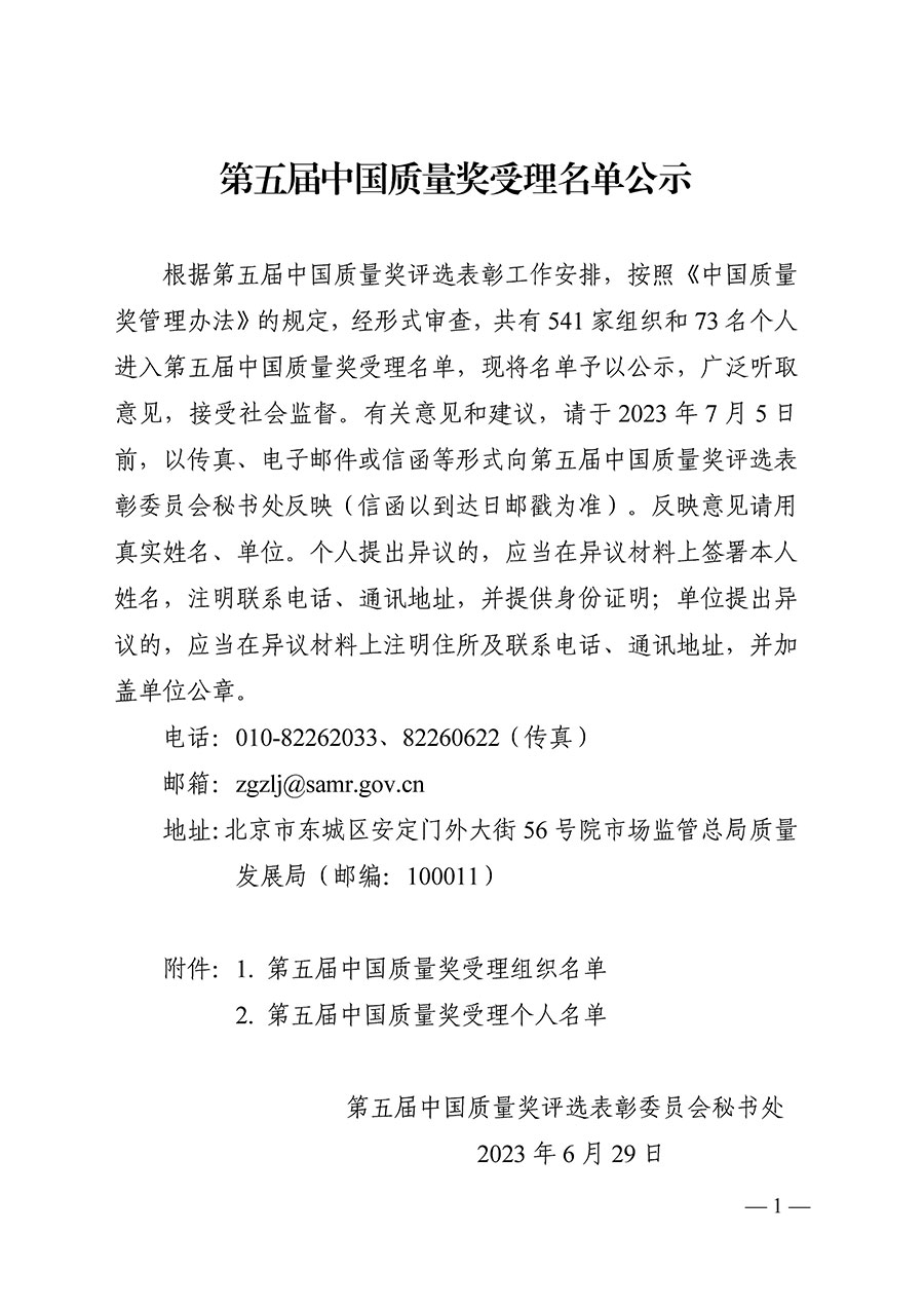 據(jù)悉,有關(guān)意見和建議可于 2023 年 7 月 5 日前,以傳真、電子郵件或信函等形式向第五屆中國(guó)質(zhì)量獎(jiǎng)評(píng)選表彰委員會(huì)秘書處反映(信函以到達(dá)日郵戳為準(zhǔn))。反映意見應(yīng)當(dāng)用真實(shí)姓名、單位。個(gè)人提出異議的,應(yīng)當(dāng)在異議材料上簽署本人姓名,注明聯(lián)系電話、通訊地址,并提供身份證明;單位提出異 議的,應(yīng)當(dāng)在異議材料上注明住所及聯(lián)系電話、通訊地址,并加蓋單位公章。