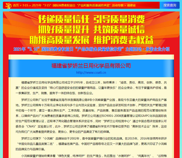 引導質(zhì)量消費,共筑質(zhì)量誠信,3月15日,由中國質(zhì)量檢驗協(xié)會主辦的2021年“3.15”產(chǎn)品和服務質(zhì)量誠信承諾的主題活動如期舉行,小浣熊作為“3.15”產(chǎn)品和服務質(zhì)量誠信承諾企業(yè),憑借匠心的品質(zhì)、優(yōu)質(zhì)的服務及良好的口碑,獲得協(xié)會以及權威專家的一致認可,榮獲“全國產(chǎn)品和服務質(zhì)量誠信示范企業(yè)”,“全國質(zhì)量誠信先進企業(yè)”、“全國質(zhì)量信譽保障產(chǎn)品”、“全國日化行業(yè)質(zhì)量領先品牌” 等多項榮譽,《中國質(zhì)量報》、《中國消費者報》及中國質(zhì)量網(wǎng)、中國經(jīng)濟網(wǎng)、中國消費網(wǎng)等多家媒體均予以集中展示和公告。