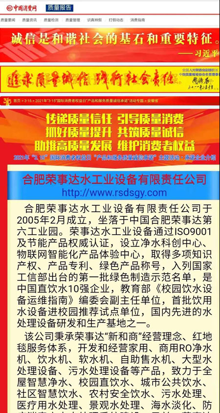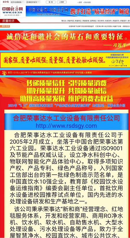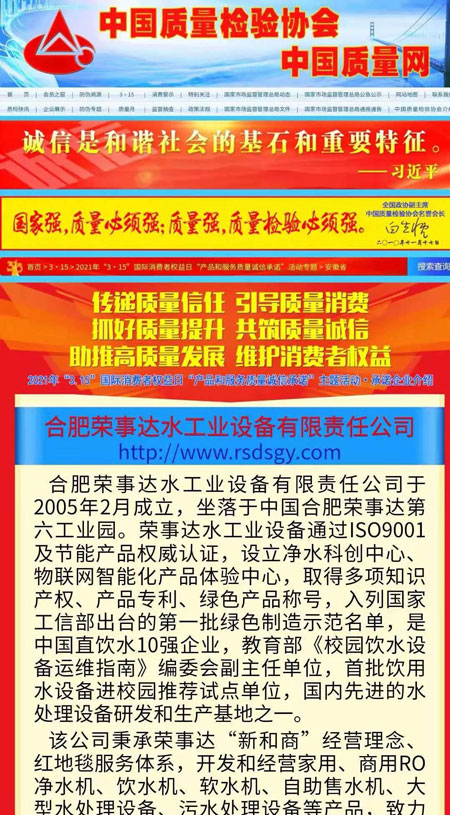 共筑質(zhì)量誠信,引導(dǎo)質(zhì)量消費。在由中國質(zhì)量檢驗協(xié)會主辦的2021年“3.15”國際消費者權(quán)益日“產(chǎn)品和服務(wù)質(zhì)量誠信承諾”主題活動中,榮事達憑借卓越的產(chǎn)品品質(zhì)及良好的社會形象,榮膺“全國產(chǎn)品和服務(wù)質(zhì)量誠信示范企業(yè)”“全國質(zhì)量信得過產(chǎn)品”“全國凈水行業(yè)質(zhì)量領(lǐng)先品牌”“全國質(zhì)量誠信先進企業(yè)”多項榮譽,《中國質(zhì)量報》、《中國消費者報》及中國質(zhì)量網(wǎng)、中國經(jīng)濟網(wǎng)、中國消費網(wǎng)等多家媒體均予以集中展示和公告。