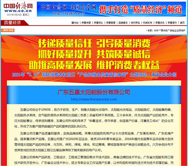 近日,在中國(guó)質(zhì)量檢驗(yàn)協(xié)會(huì)舉辦的2021年“3·15”國(guó)際消費(fèi)者權(quán)益日“產(chǎn)品和服務(wù)質(zhì)量誠(chéng)信承諾”主題活動(dòng)中,五星公司憑借一貫穩(wěn)定的產(chǎn)品質(zhì)量和優(yōu)良服務(wù)的口碑,被評(píng)為全國(guó)產(chǎn)品和服務(wù)質(zhì)量誠(chéng)信示范企業(yè);五星品牌下的五星光伏電站、太陽能(熱泵)熱水系統(tǒng),從眾多企業(yè)中脫穎而出,被評(píng)為全國(guó)質(zhì)量檢驗(yàn)穩(wěn)定合格產(chǎn)品。