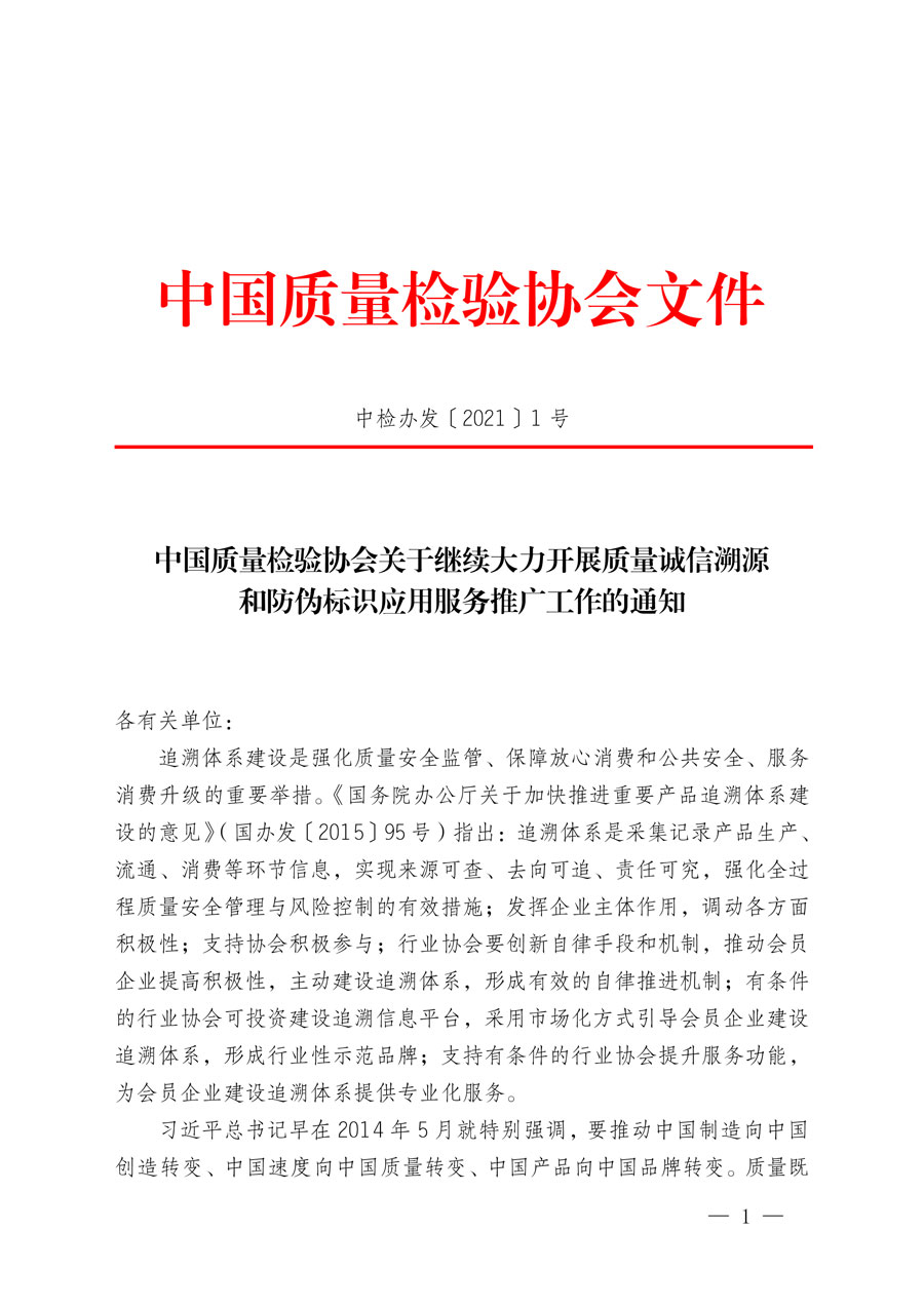 中國質(zhì)量檢驗協(xié)會關(guān)于繼續(xù)大力開展質(zhì)量誠信溯源