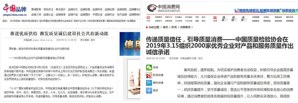 •中國(guó)消費(fèi)網(wǎng)《傳遞質(zhì)量信任,引導(dǎo)質(zhì)量消費(fèi)——中國(guó)質(zhì)量檢驗(yàn)協(xié)會(huì)在2019年3.15組織2000家優(yōu)秀企業(yè)對(duì)產(chǎn)品和服務(wù)質(zhì)量作出誠(chéng)信承諾》