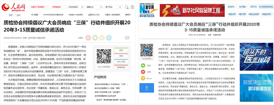新華網(wǎng)《質(zhì)檢協(xié)會持續(xù)倡議廣大會員響應(yīng)“三保”行動并組織開展2020年3·15質(zhì)量誠信承諾活動》