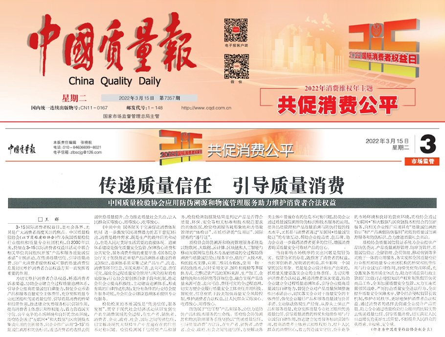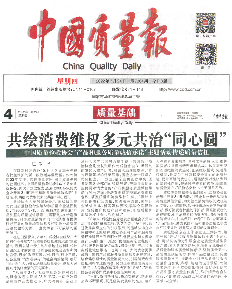 中國質(zhì)量報(bào)(3月15日刊第2版):推動質(zhì)量共治 優(yōu)化營商環(huán)境 共筑質(zhì)量誠信——中國質(zhì)量檢驗(yàn)協(xié)會攜手2000余家企業(yè)組織開展“3 ·15”產(chǎn)品和服務(wù)質(zhì)量誠信承諾主題活動