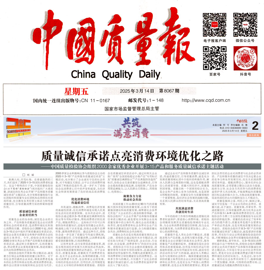 《中國(guó)質(zhì)量報(bào)》(2025年3月14日刊)發(fā)布:質(zhì)量誠(chéng)信承諾點(diǎn)亮消費(fèi)環(huán)境優(yōu)化之路——中國(guó)質(zhì)量檢驗(yàn)協(xié)會(huì)組織2000余家優(yōu)秀企業(yè)開展3·15產(chǎn)品和服務(wù)質(zhì)量誠(chéng)信承諾主題活動(dòng)