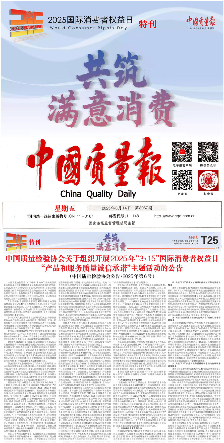 《中國(guó)質(zhì)量報(bào)》(2025年3月14日刊)發(fā)布:中國(guó)質(zhì)量檢驗(yàn)協(xié)會(huì)關(guān)于組織開展2025年“3·15”國(guó)際消費(fèi)者權(quán)益日“產(chǎn)品和服務(wù)質(zhì)量誠(chéng)信承諾”主題活動(dòng)的公告(2025年第6號(hào))
