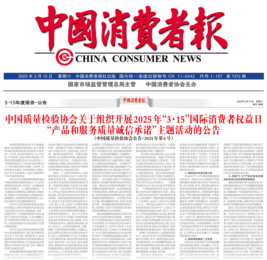 《中國(guó)消費(fèi)者報(bào)》(2025年3月15日刊)發(fā)布:中國(guó)質(zhì)量檢驗(yàn)協(xié)會(huì)關(guān)于組織開展2025年“3·15”國(guó)際消費(fèi)者權(quán)益日“產(chǎn)品和服務(wù)質(zhì)量誠(chéng)信承諾”主題活動(dòng)的公告(2025年第6號(hào))