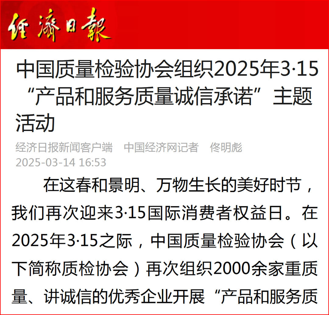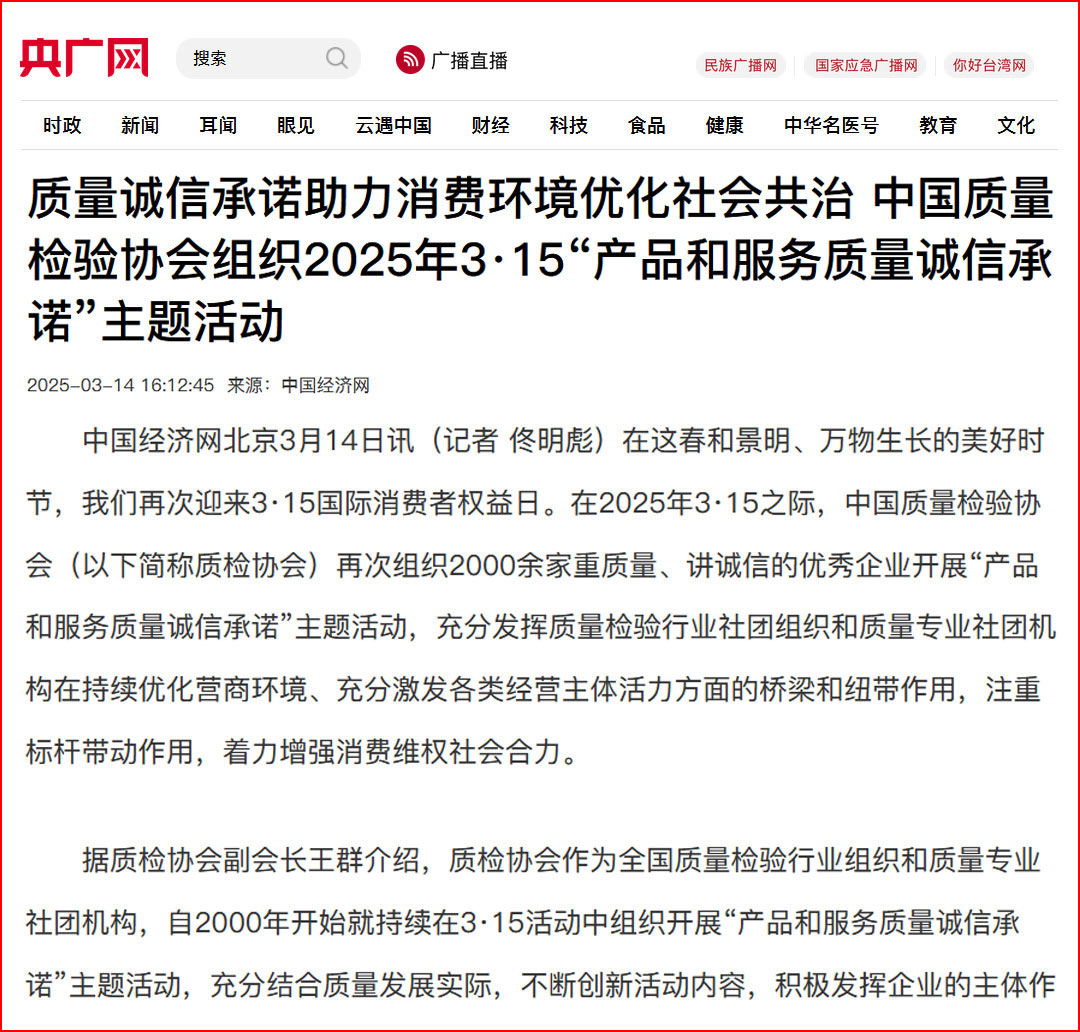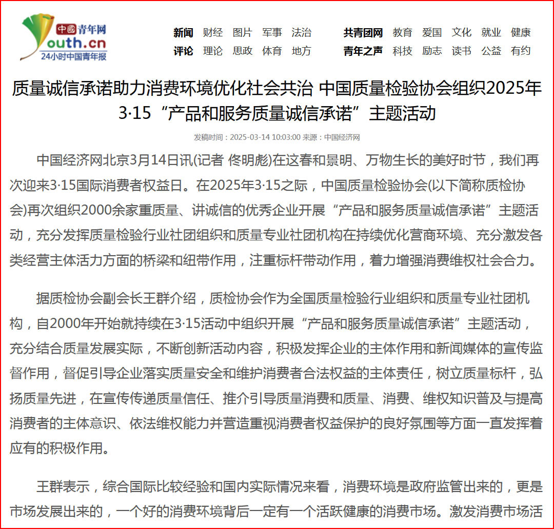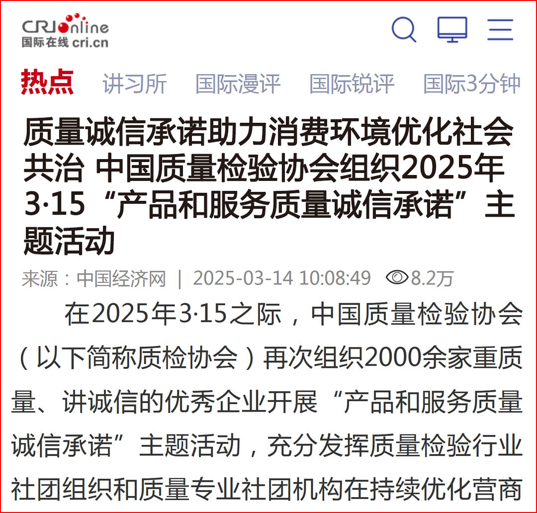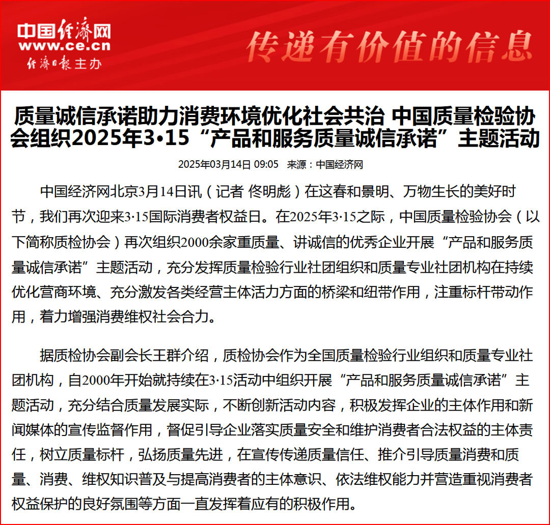 中國(guó)經(jīng)濟(jì)網(wǎng)“質(zhì)量經(jīng)濟(jì)頻道”發(fā)布:中國(guó)質(zhì)量檢驗(yàn)協(xié)會(huì)開展2025年3·15“產(chǎn)品和服務(wù)質(zhì)量誠(chéng)信承諾”主題活動(dòng)