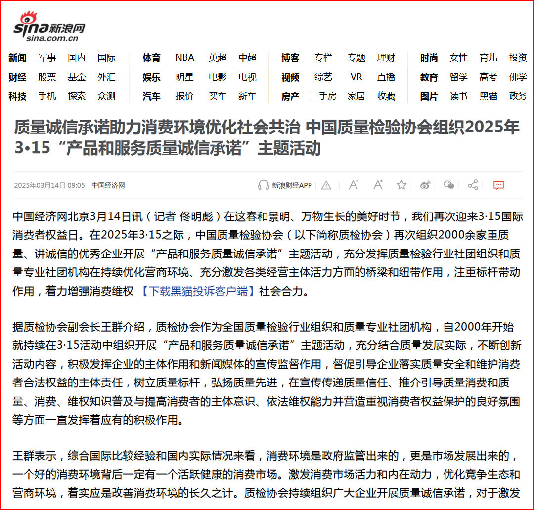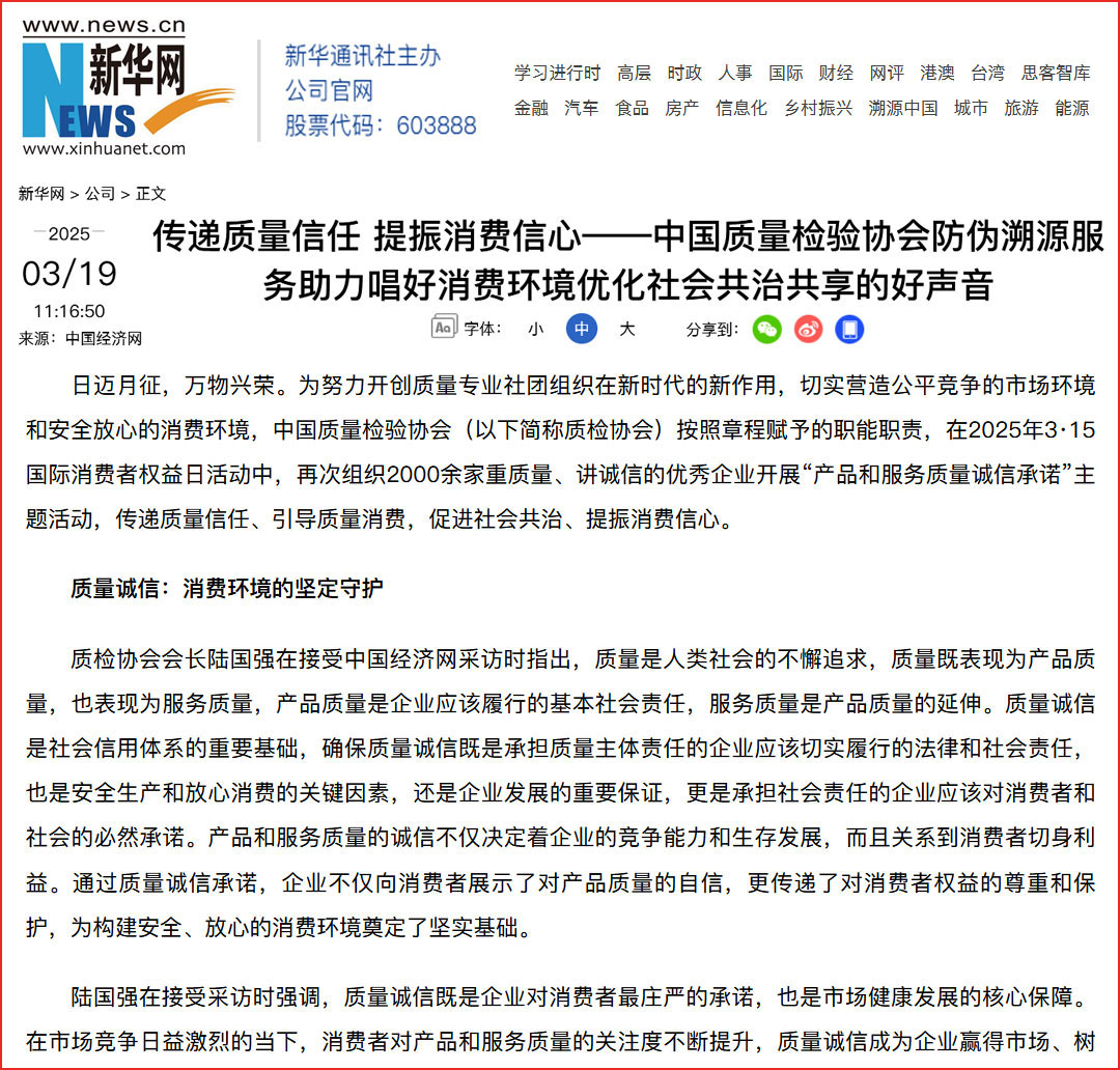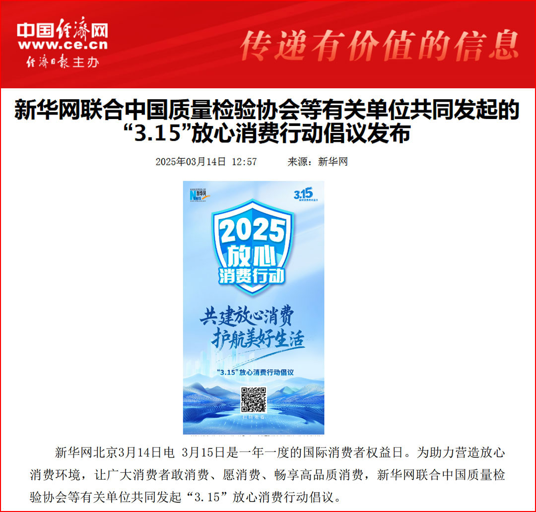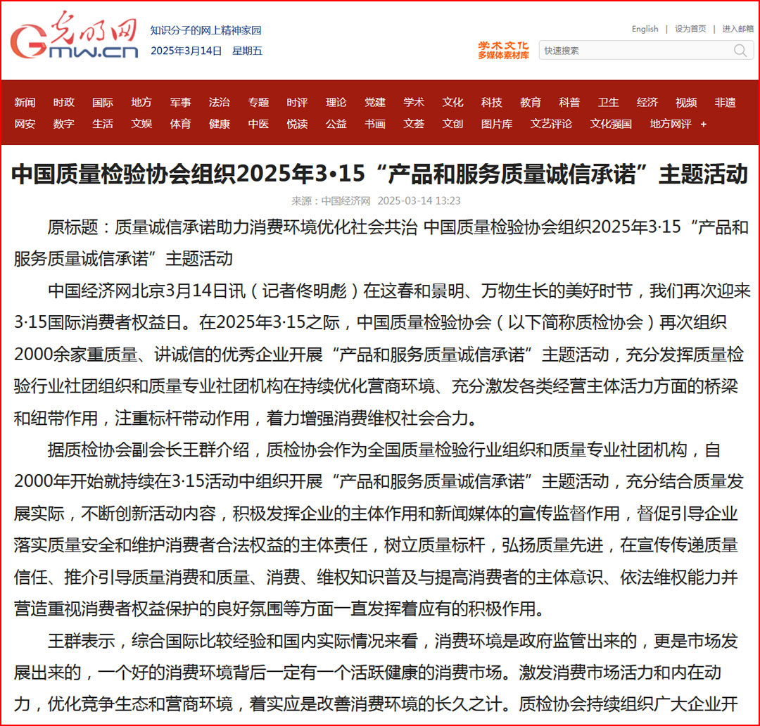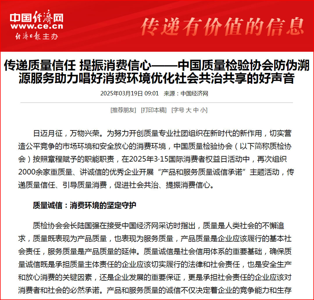 中國(guó)經(jīng)濟(jì)網(wǎng)“質(zhì)量經(jīng)濟(jì)頻道”發(fā)布:中國(guó)質(zhì)量檢驗(yàn)協(xié)會(huì)開展2025年3·15“產(chǎn)品和服務(wù)質(zhì)量誠(chéng)信承諾”主題活動(dòng)