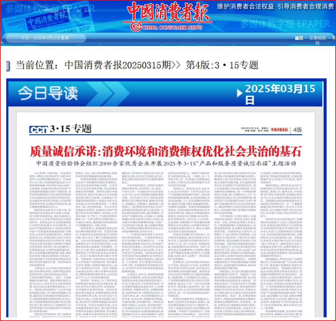 《中國(guó)消費(fèi)者報(bào)》(2025年3月15日刊)發(fā)布:質(zhì)量誠(chéng)信承諾:消費(fèi)環(huán)境和消費(fèi)維權(quán)優(yōu)化社會(huì)共治的基石——中國(guó)質(zhì)量檢驗(yàn)協(xié)會(huì)組織2000余家優(yōu)秀企業(yè)開展2025年3·15“產(chǎn)品和服務(wù)質(zhì)量誠(chéng)信承諾”主題活動(dòng)